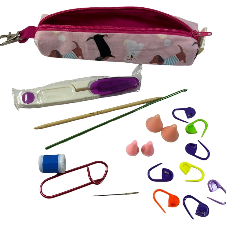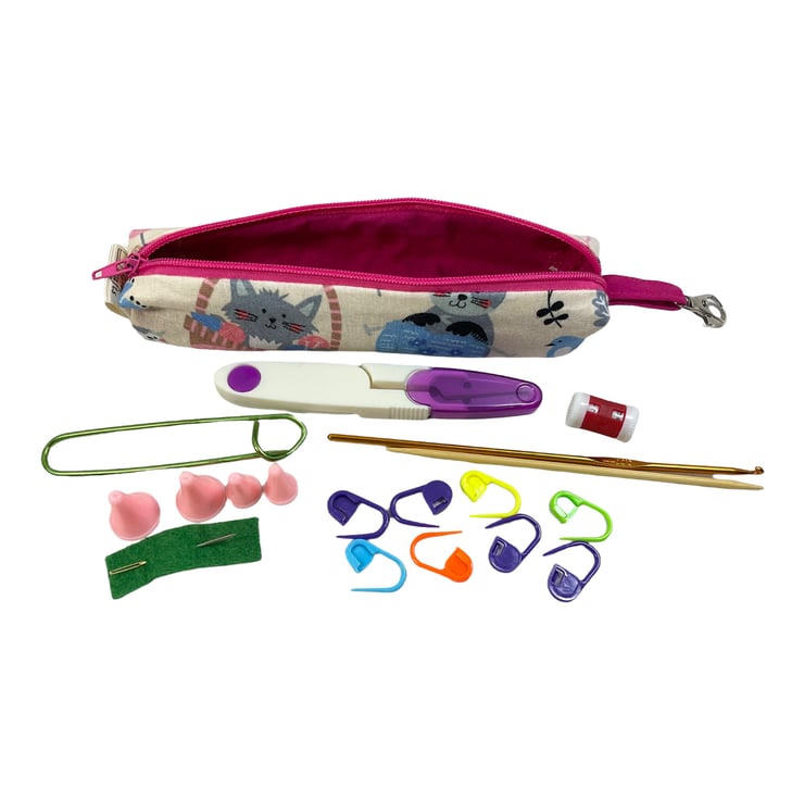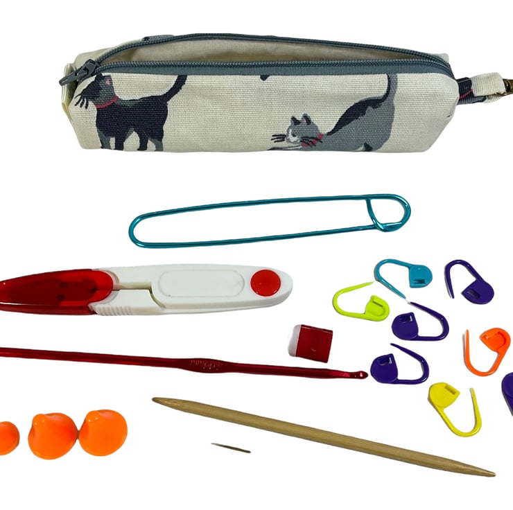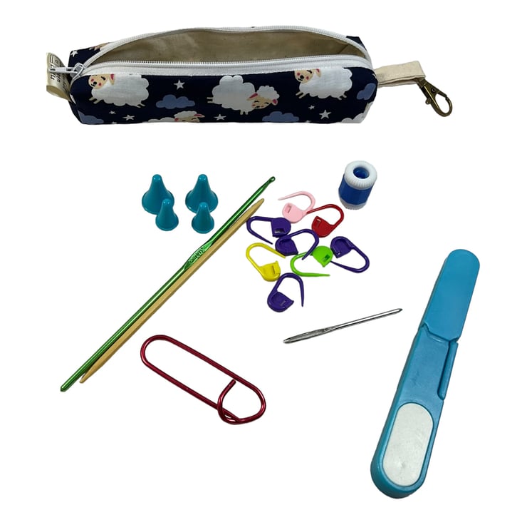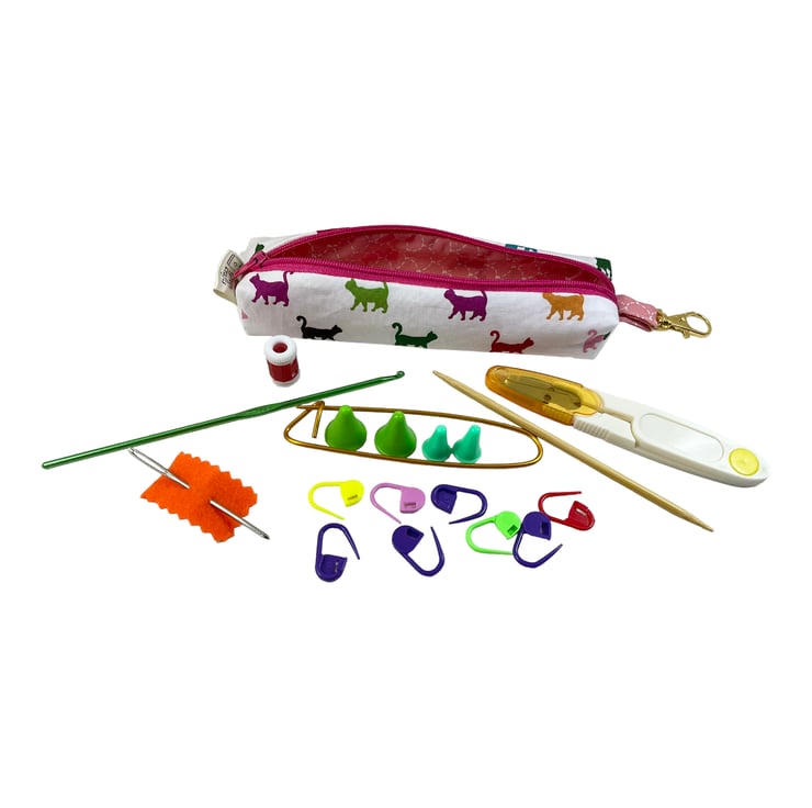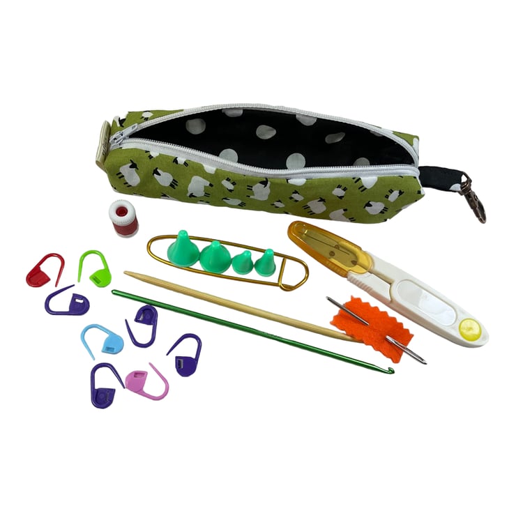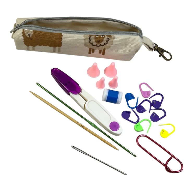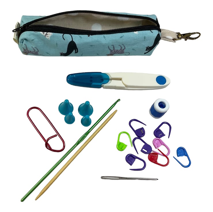 This little zip case is an elongated lip balm case, so small, but also roomy enough for the contents and more you might want to add. The cotton, fully lined case comes complete with a pair of yarn thread snips, 8 locking stitch markers, 4 point protectors- 2 large and 2 small, a metal crochet hook, a row counter, stitch holder, a cable needle and a yarn needle.