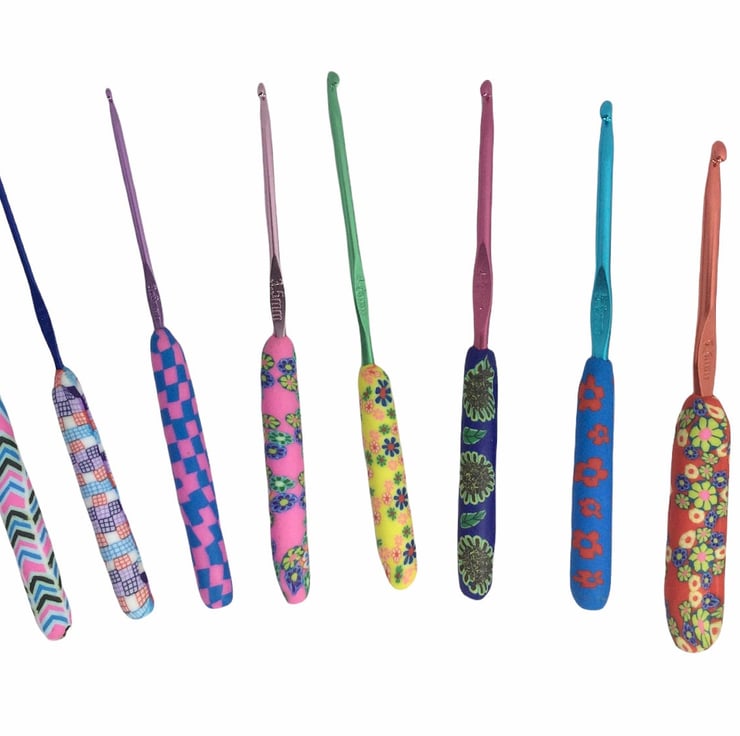 These lovely hooks are made from aluminium and the ergonomic handles are premium soft clay ( Fimo I think) each hook is so pretty and bright, the aluminium hooks are all different colours and the handles are the prettiest patterns, some floral and some geometric.