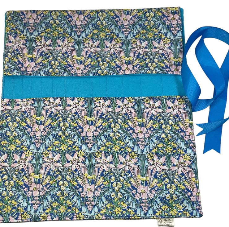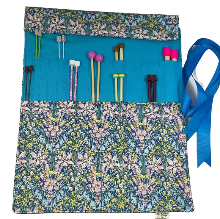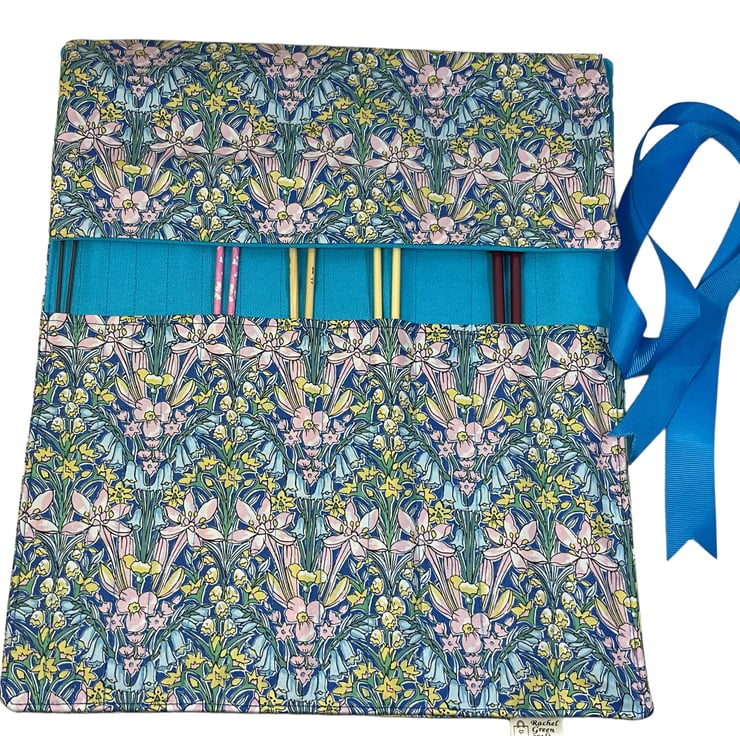 The case itself is interfaced for sturdiness and has 2 pockets, the lower pocket houses 13 sets of needles and above in the turquoise pocket is space for 13 more. There is a deep flap with matching fabrics and the entire case is topstitched for neatness. The case rolls up and is fastened by turquoise grosgrain ribbon. needles not included in sale. Pattern placement may vary.
