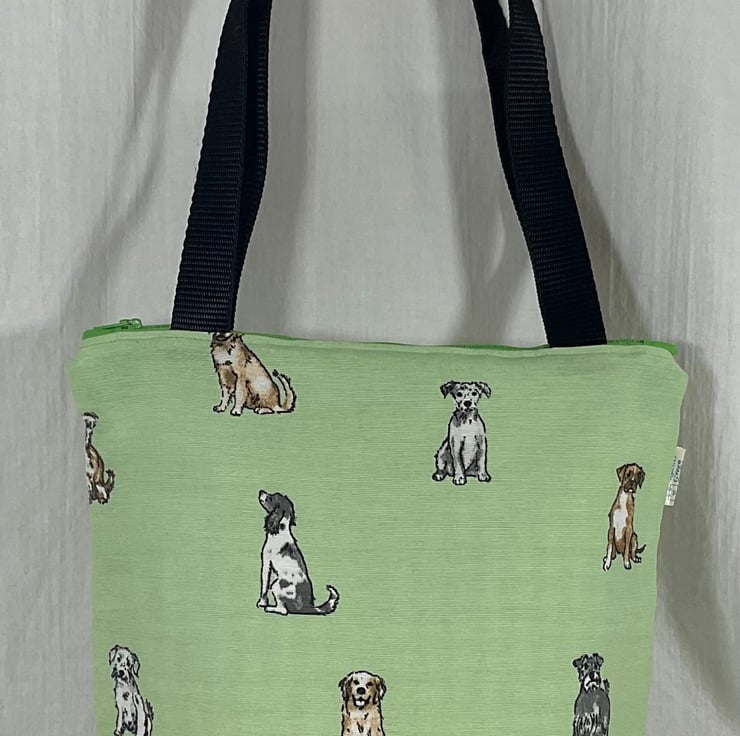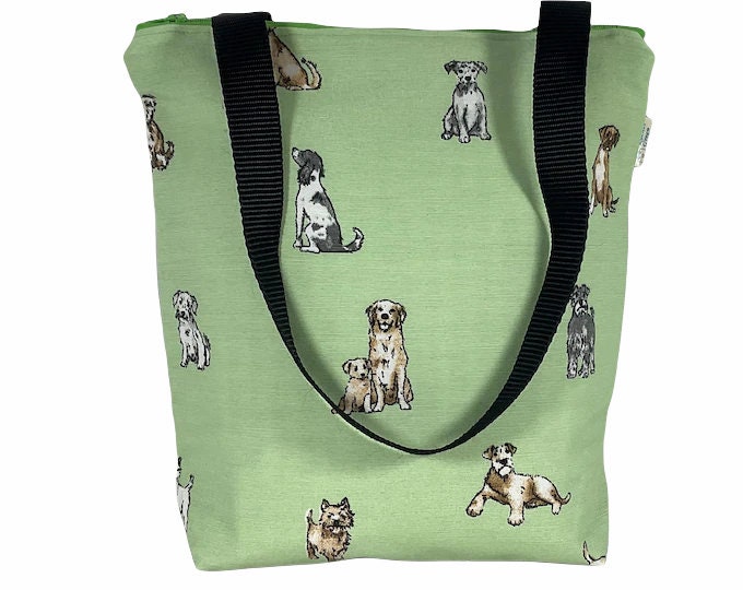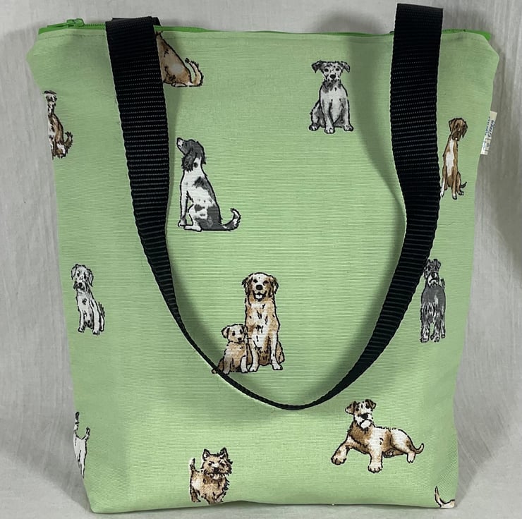 This bag is made entirely from heavy weight fabrics so has great form. The main is a variety of dog breeds print On a mid green coloured base. The bag is lined in beige with white check patterned canvas cotton fabric. A full width set of slip pockets is made in the dog fabric and lined with the patterned, this is divided into 2. The bag has a boxed base and is fully interfaced for strength and form. The tote securely closes with a toning nylon zip. There are 2 decent length handles in strong nylon webbing in black.