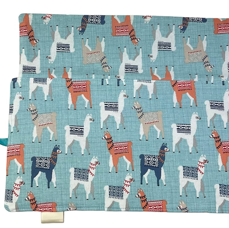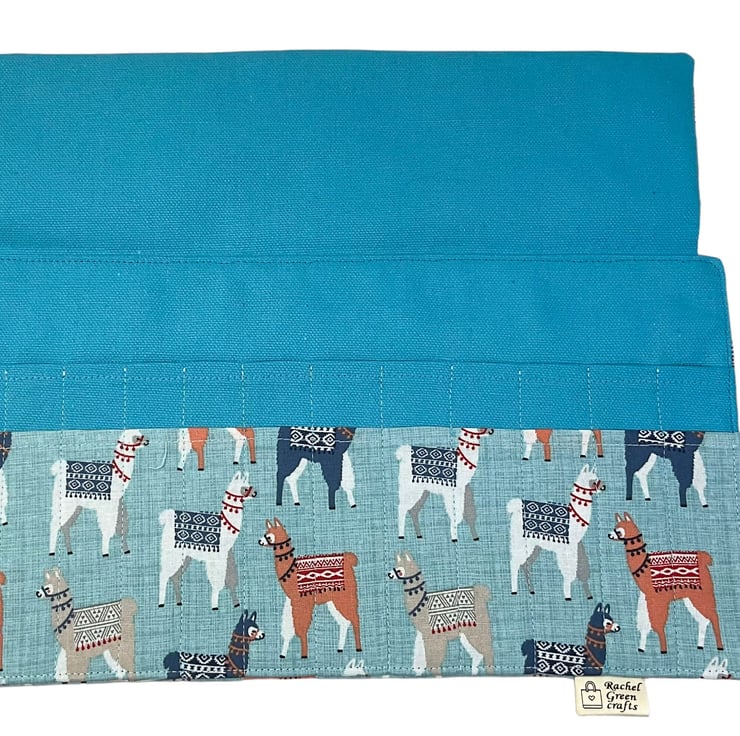 A really lovely fun multi llamas fabric is the centrepiece of this crochet hook case, set on a smoky blue texture effect background. Would also work well for shorter narrow diameter Dpns too. I have carefully paired it with heavier weight cotton canvas in turquoise blue for the lining, underside of the flap and upper needle pocket.