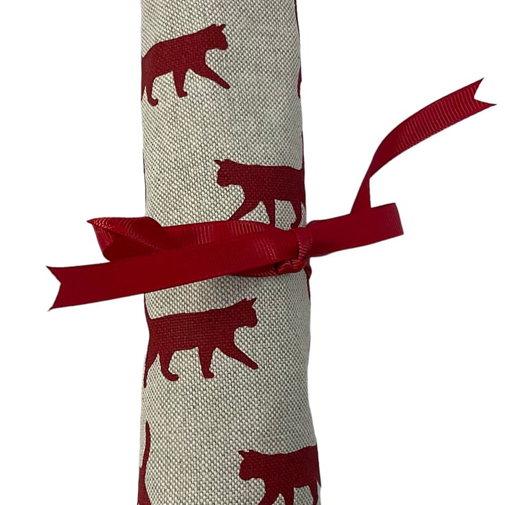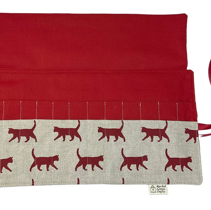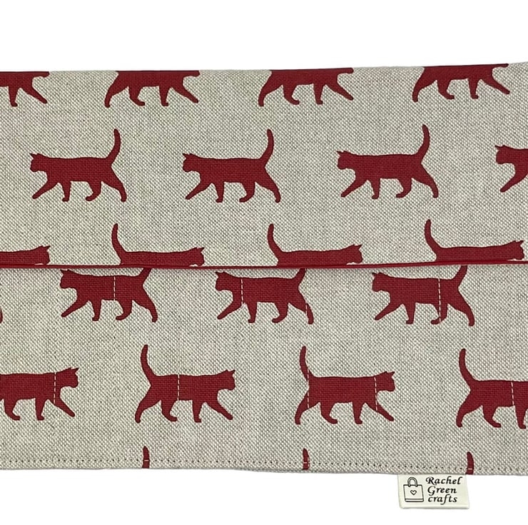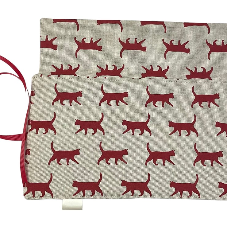 A really lovely deep red walking cats patterned fabric in a heavier weight canvas is the centrepiece of this crochet hook case, set on a natural background. Would also work well for shorter narrow diameter Dpns too. I have carefully paired it with a bright red cotton for the lining, underside of the flap and upper needle pocket.