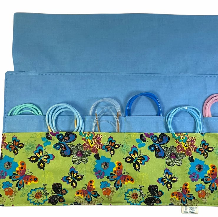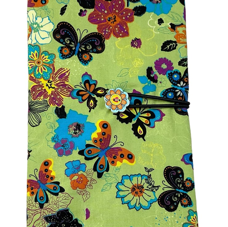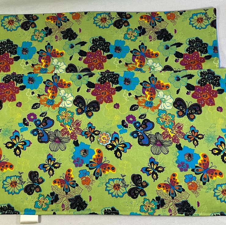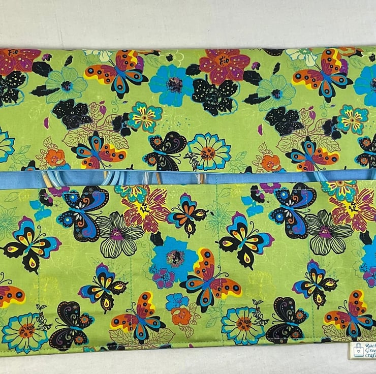 I have used a very pretty butterflies and floral print cotton fabric In jewel shades on a mid lime green background. This fabric is used for the outer, outside of the flap and lower pocket and a turquoise blue cotton fabric is used to line the case, the inside of the flap and the upper needle pocket. The case is interfaced for structure and strength and topstitched all around for neatness.