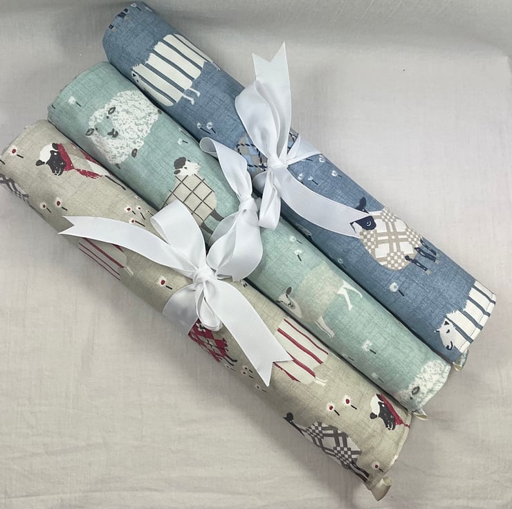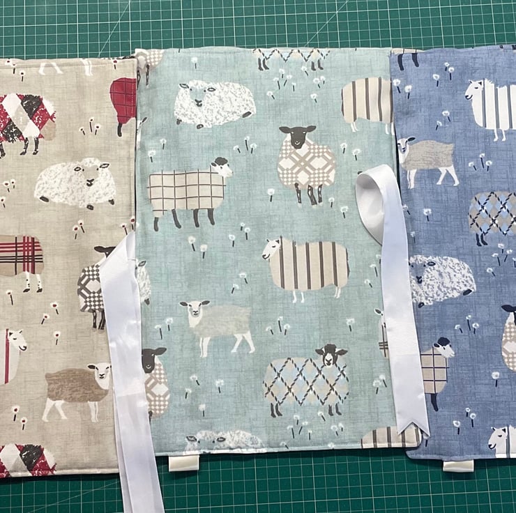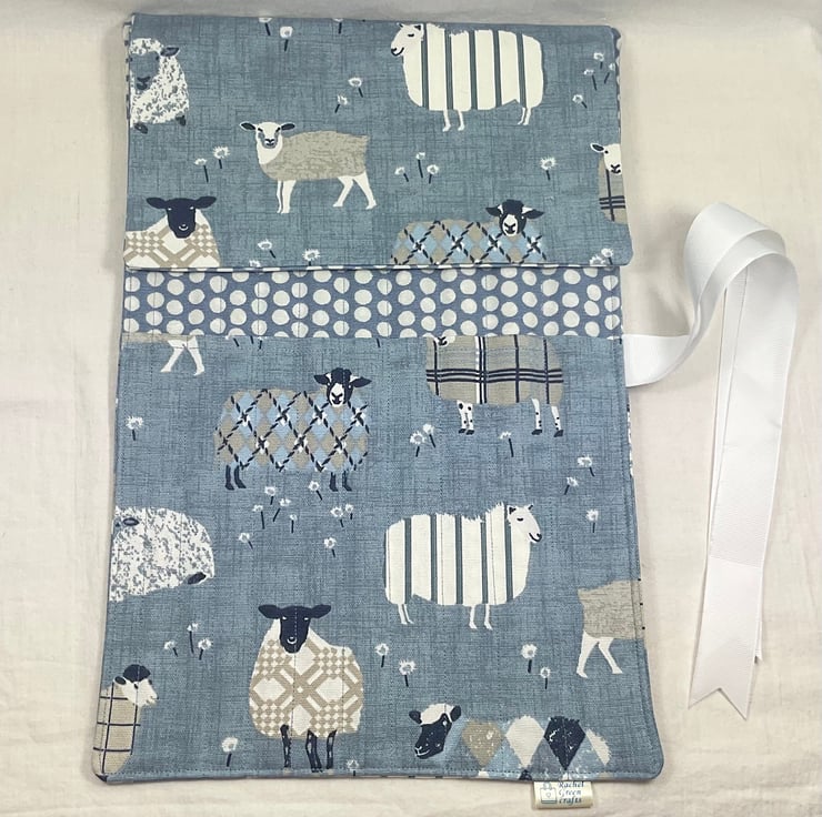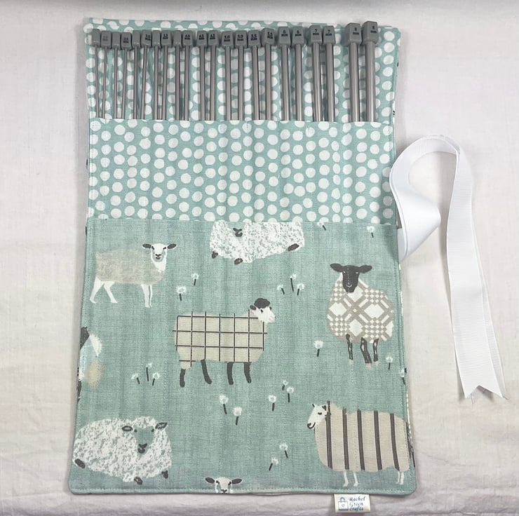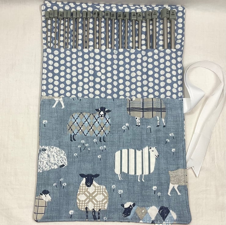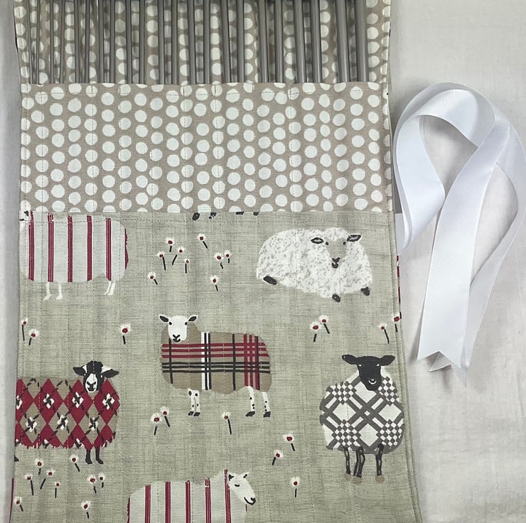 This case is made entirely in a heavy cotton canvas fabric, it will last for years! The main is a cute tartan plaid style sheep cotton with a toning white spots fabric.. There is a choice of denim blue with denim spot, turquoise blue with turquoise spot and red with light coffee spot. The case itself is interfaced for sturdiness and has 2 pockets, the upper pocket houses the 11 sets of stainless steel needles and below in the sheep pocket is space for 11 more. The case rolls up and is fastened by white grosgrain ribbon.