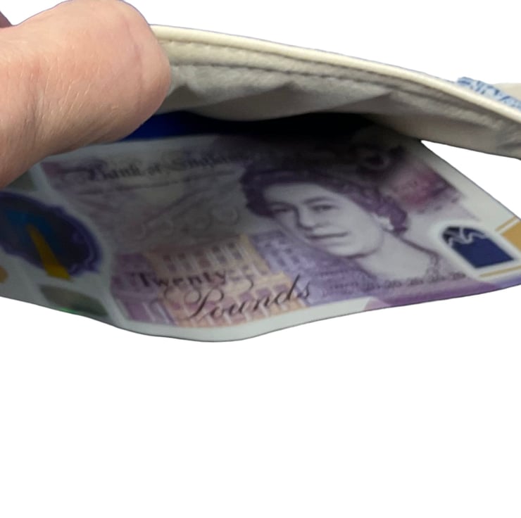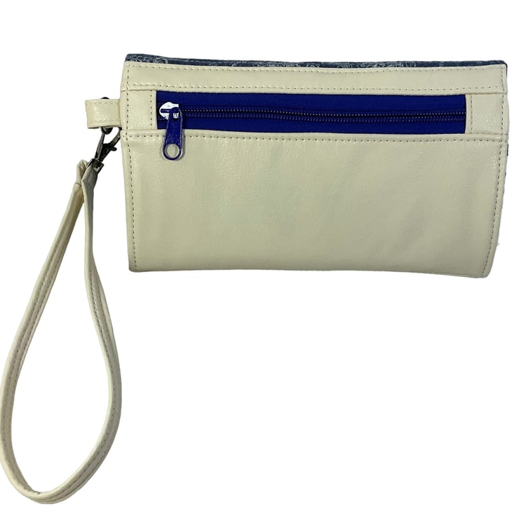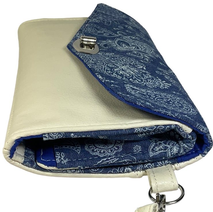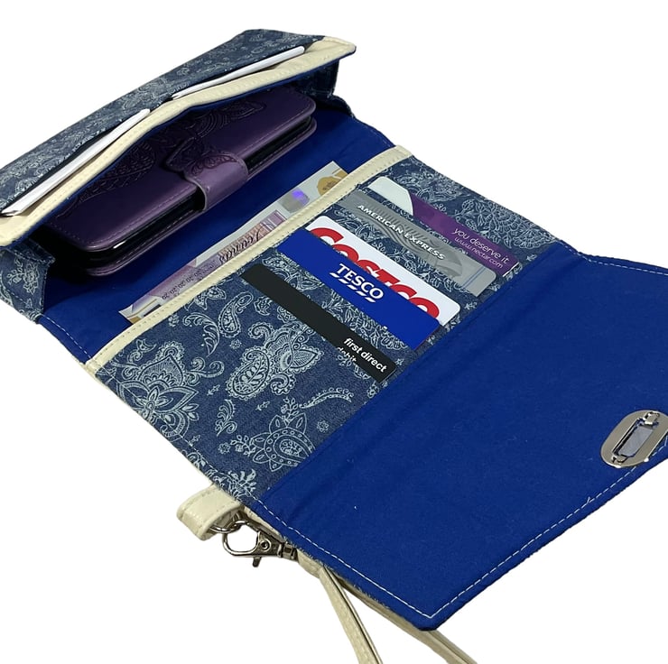 Made in classy cream faux leather and pretty floral paisley denim cotton along with royal blue cotton for the lining, This clever bag has a large padded compartment for your phone with pleated sides. Plenty big enough for most phones. Please check yours against dimensions below. On the outside of this are 2 slip pockets, handy for receipts etc. Alongside this is a large stretch of card slots, 5 in all but can hold more than 1 card in each, under this is a full width slot for money notes.