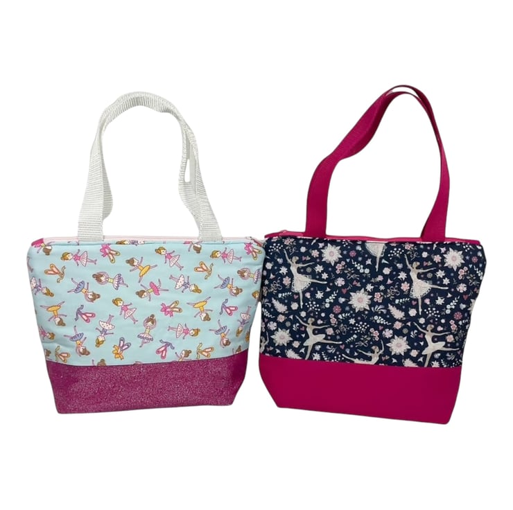 The main fabric is a cute ballerina print cotton on a pale blue background. The base of the bag is made in cerise pink glitter fabric. This would also make it into a great bag for little girls, how about a ballet bag? or even a large pencil case. The bag closes with a nylon zip.