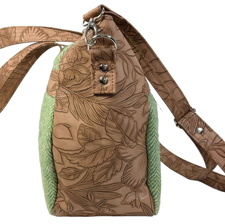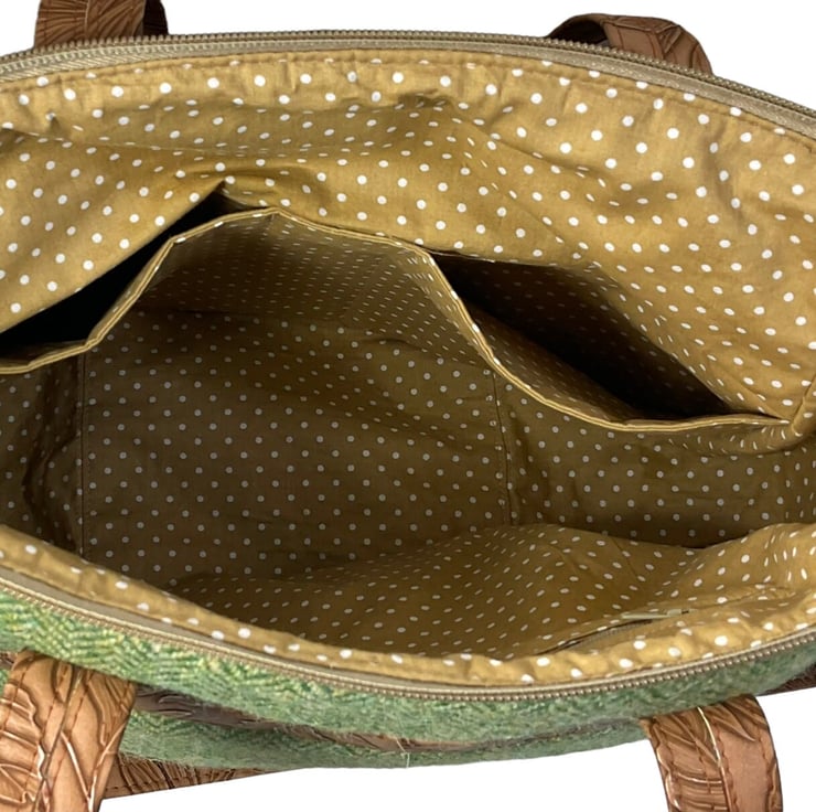 Made in gorgeous mid caramel shade floral embossed faux leather and paired with beautiful pure wool Harris tweed in a grass green and buttermilk tweedy herringbone pattern, the bag itself is a gusseted tote style, with many pockets - 1 zipped outer, 1 zipped inner and a side of slip pockets, 2 larger that fit a phone perfectly and a small pen pocket centrally. The lining is beige with off white spot print cotton. The bag closes with a full length zip.