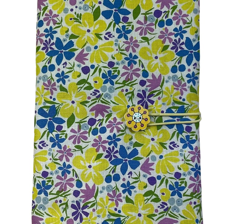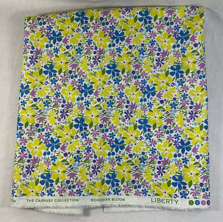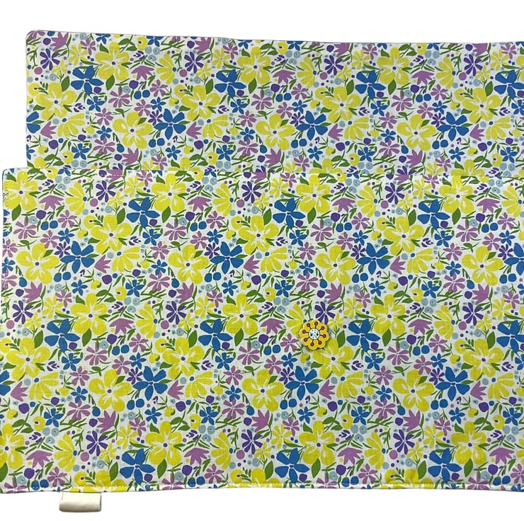 I have used Libertys Lasenby cotton, heavier than their tana lawn cotton and therefore much more suitable for needle storage. This is Libertys Bohemian Bloom a very pretty lemon, blue, green and lilac floral print cotton fabric on an off white background. This fabric is used for the outer, outside of the flap and lower pocket and a dark turquoise cotton fabric is used to line the case, the inside of the flap and the upper needle pocket. The case is interfaced for structure and strength and topstitched all around for neatness.
