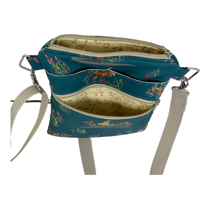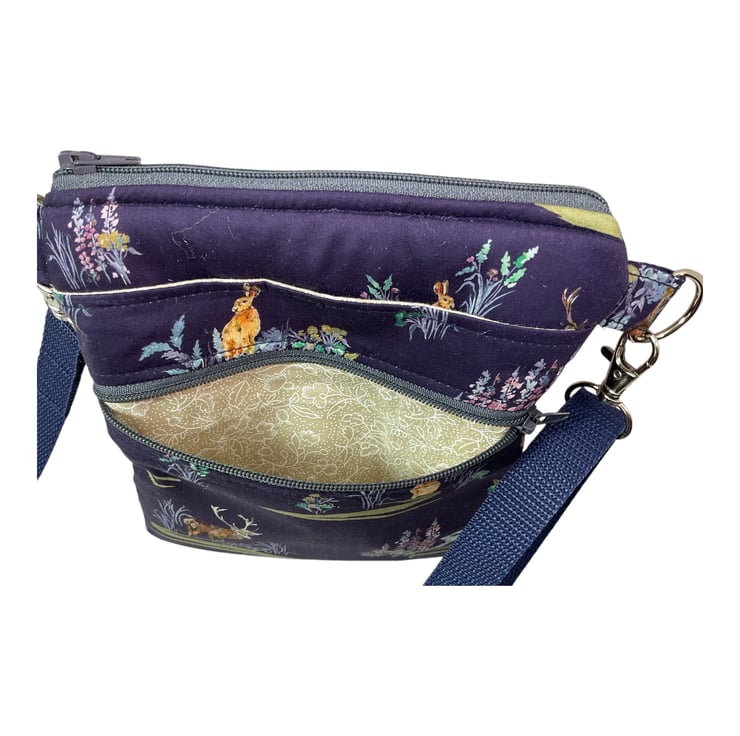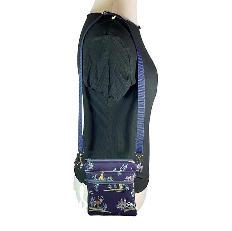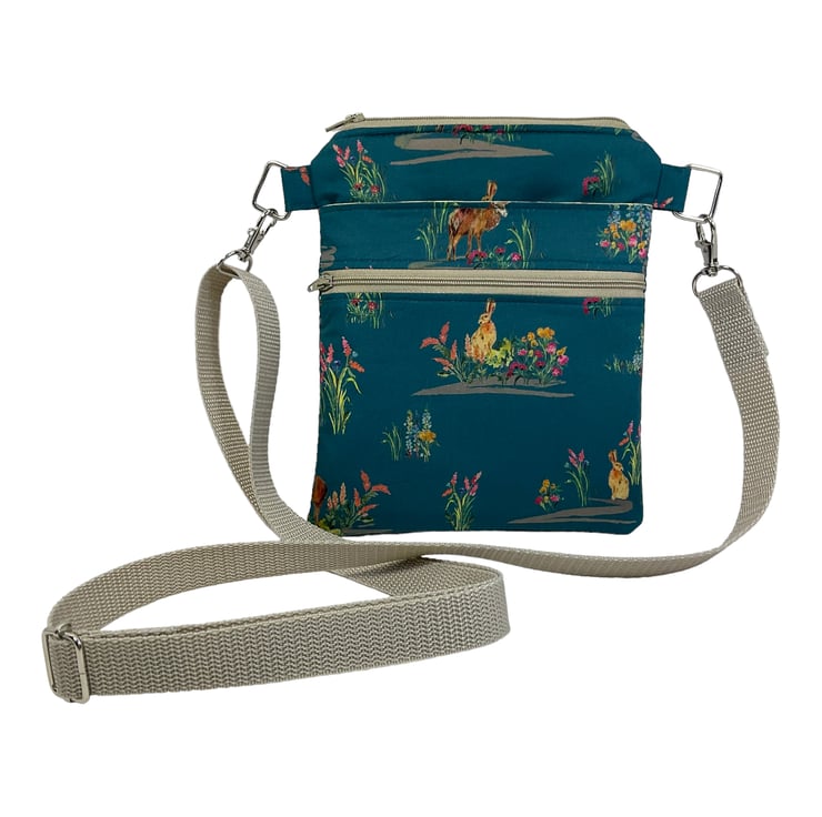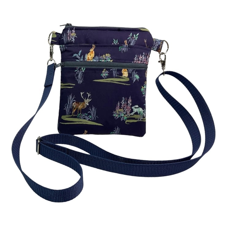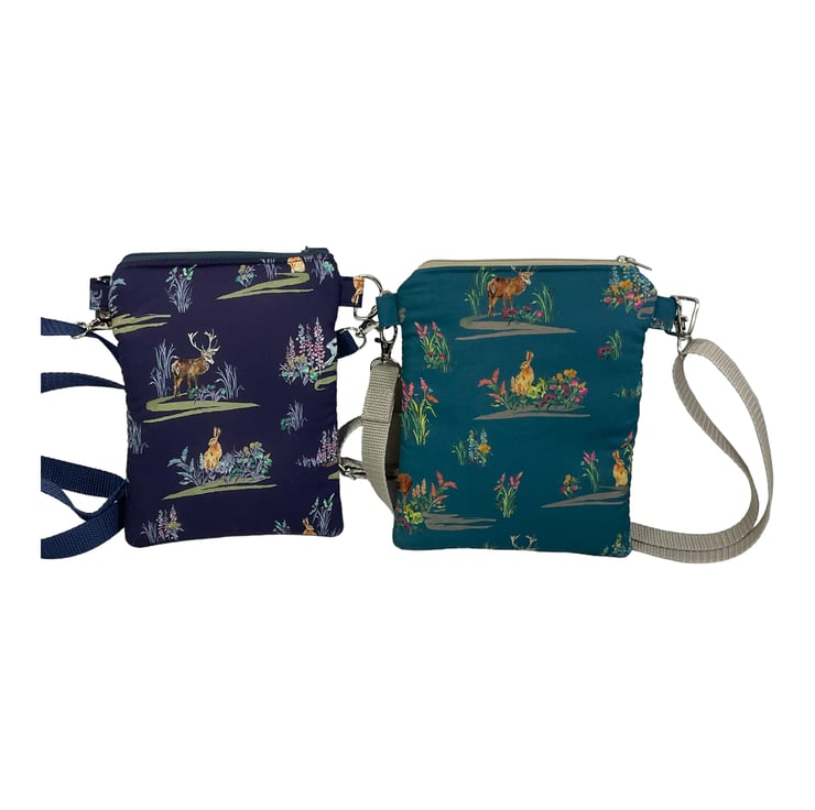A choice of 2 unusual woodland print Liberty small phone sized shoulder bag. Made in Liberty's luxury Tana Lawn with its almost silk like texture, this print features stags and hares along with flora, on either a teal blue or inky blue base.( pattern placement may vary)