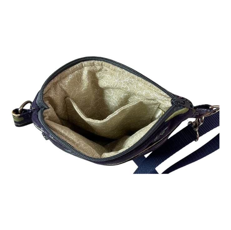 inside is a phone pocket that can hold my iphone 6 in its case. There are also another 2 pockets externally, one a full width slip and another zipped which is also full width. The strong nylon heavyweight webbing strap is in navy on the inky blue one and beige on the teal base and is fully detachable, it clips on with 2 swivel lanyard clips. The strap itself is approx 133cm (52.5") in length, long enough to go across your body and is fully adjustable. Each bag closes with a toning zip. The bag is fully wadded and interfaced for structure. Pattern placement may vary, contents shown for display and not included in sale.