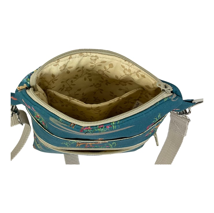This handy bag is slim so sits close to your body, and will hold the basics when you want to grab a small bag for a trip out. I have managed to fit a purse, my phone (iPhone XS in a case) and a diary. The inky blue is lined in cream coloured cotton while the teal is in cream, both with a small all over leaf/ flower print.
