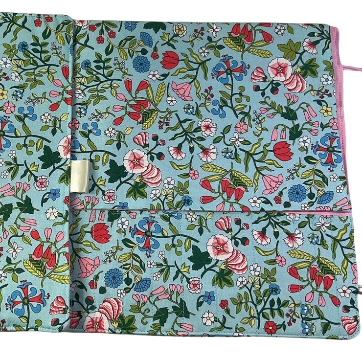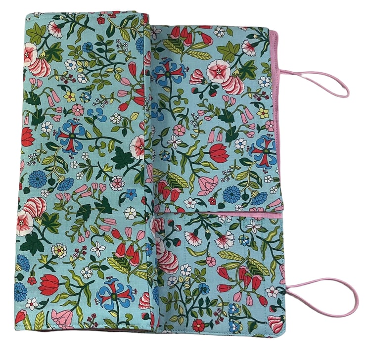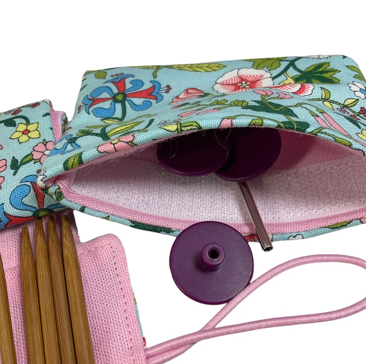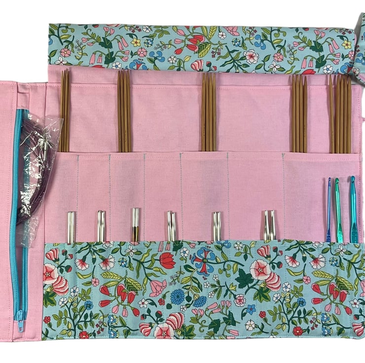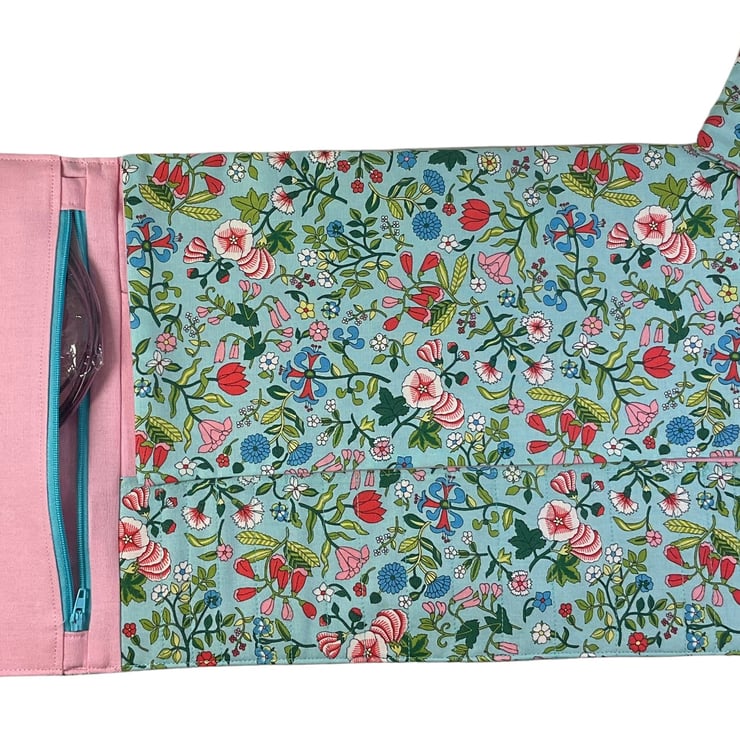 This Liberty print is Wildflower Field a pretty bright shades floral with sage green foliage on turquoise blue. The lining and accent is a heavier weight pale candy pink shade of linen look cotton fabric. The lower pockets will hold 13 sets - a complete set of interchangeables - from 4" in length right up to 10mm, there are also 3 slots in this pocket that will hold crochet hooks. In the pocket above there are 7 slots in graduated sizes, that can hold DPN 8" or longer. depending on the size of your needles, these slots can house more than one set.