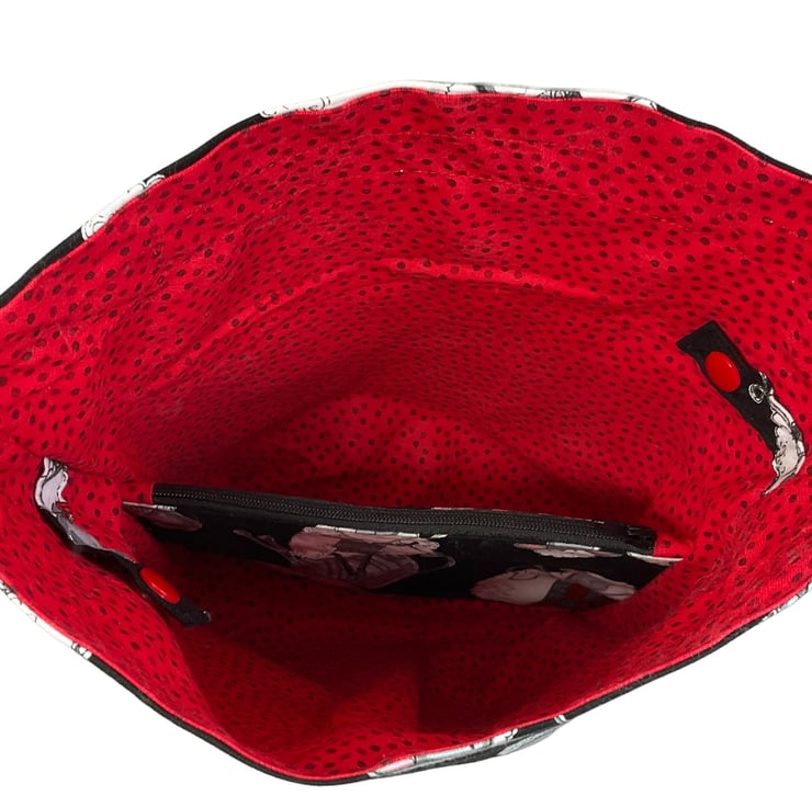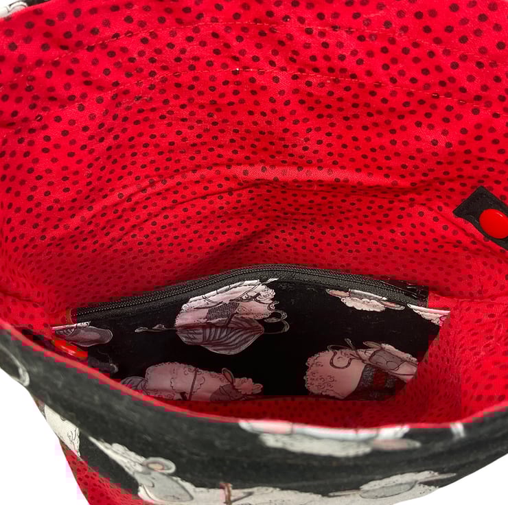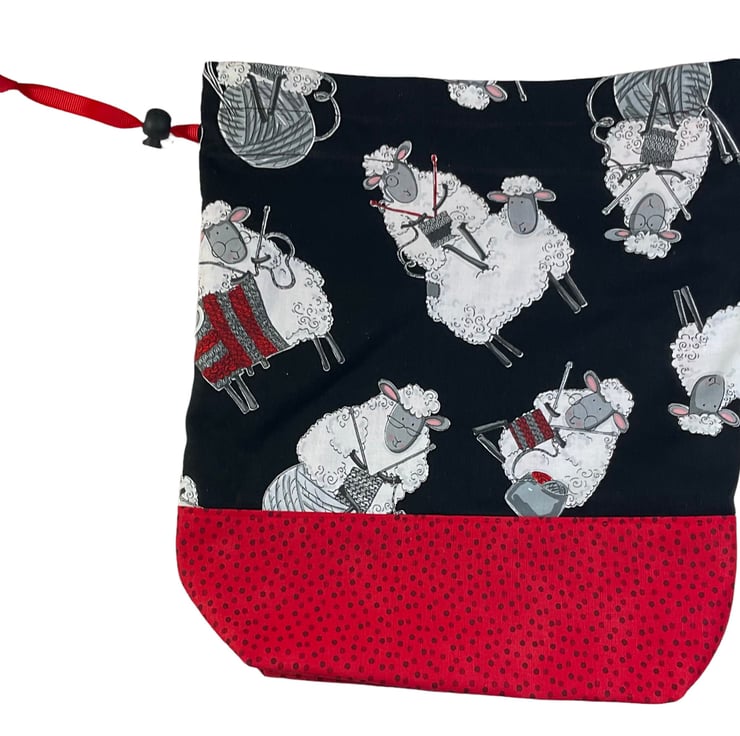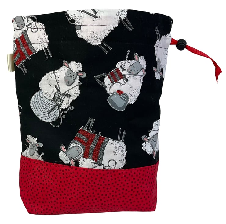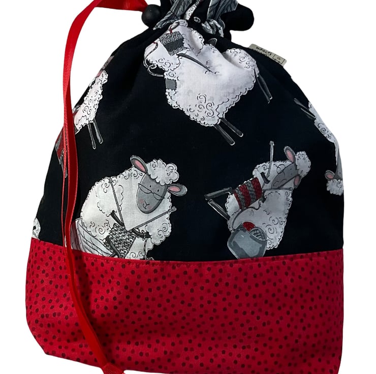 This is a two at a time knitting bag, but it also could be used for other things. It has the cutest knitting sheep print cotton on a black background and I have paired it with a bright red with black spot lining and exterior accent piece. The divider inside the bag is a fixed zip pouch that has the exterior and lining matching as the main bag itself. Inside are 2 fabric matched yarn guides, fastened with snaps. The lower portion of the bag is interfaced and boxed so it stands up.