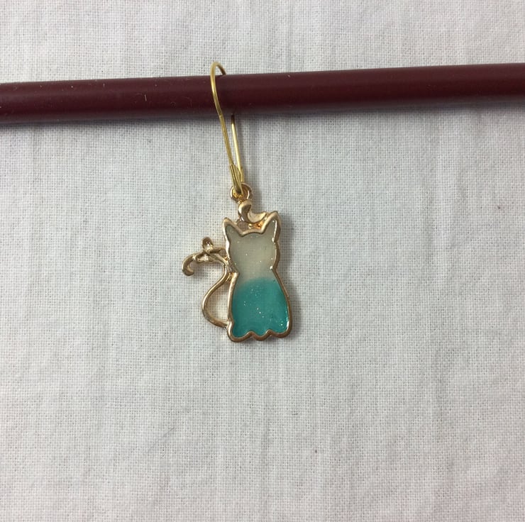 Gorgeous Glittery gold plated cat charms .supplied on gold plated locking markers. Due to them being able to be opened these work equally well for knitting and crochet. These little cats have plastic glitter bodies surrounded by gold plated outer.