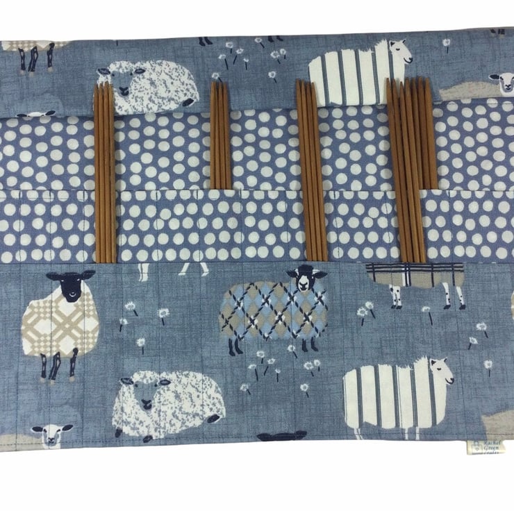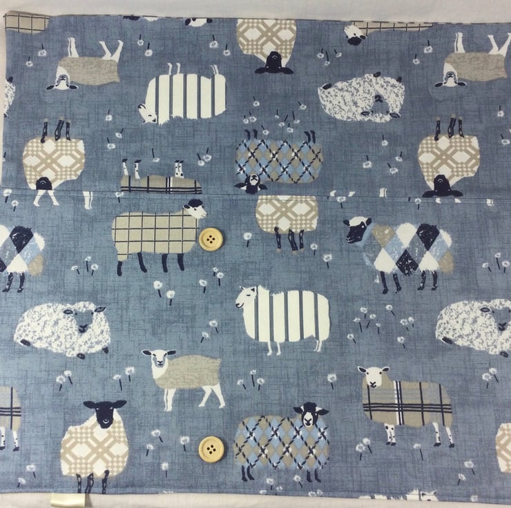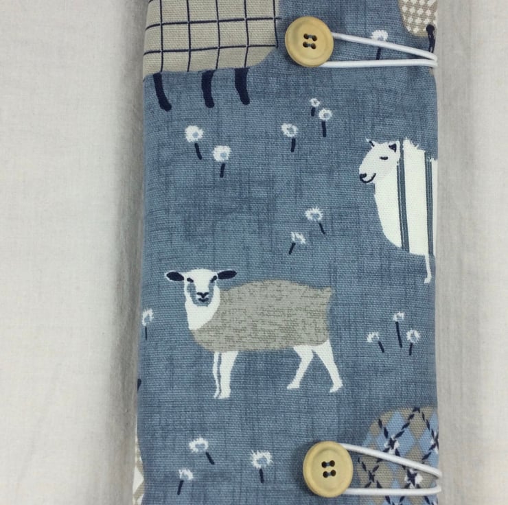 This case is made from A lovely heavyweight tartanargyle sheep print cotton in shades of Denim blue grey, brown and white on a denim blue background The case can can also be used for straight needles up to 25.5cm (10") or maybe crochet hooks.