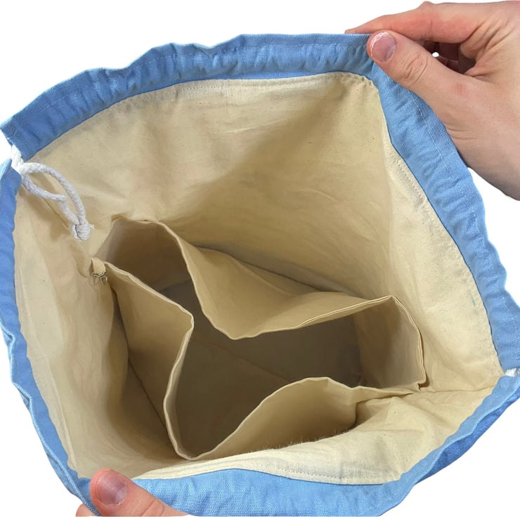 On the top are 2 strong cotton webbing handles for carrying and it closes with 2 plaited cotton drawstrings that close by pulling each end.