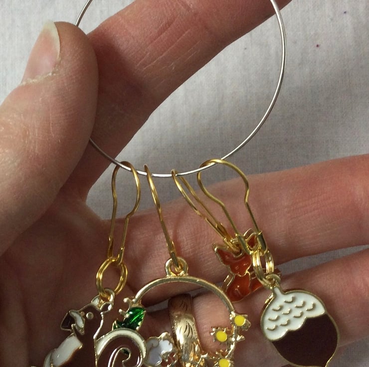 Set of 4, 1 fox, one ring with a squirrel, 1 squirrel and 1 acorn. Fits up to 7mm (approx US 10.5) needles.