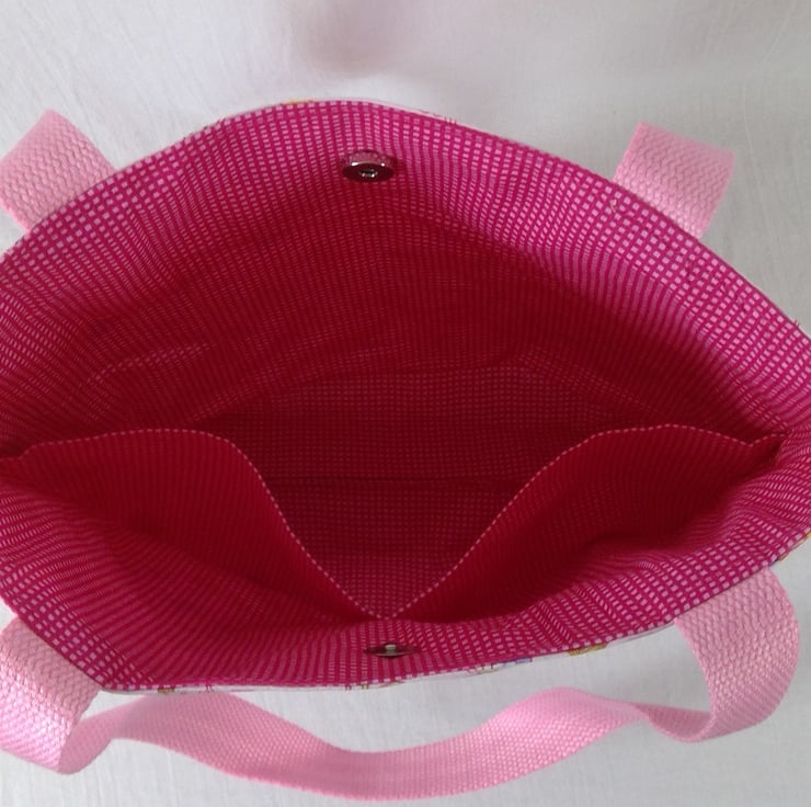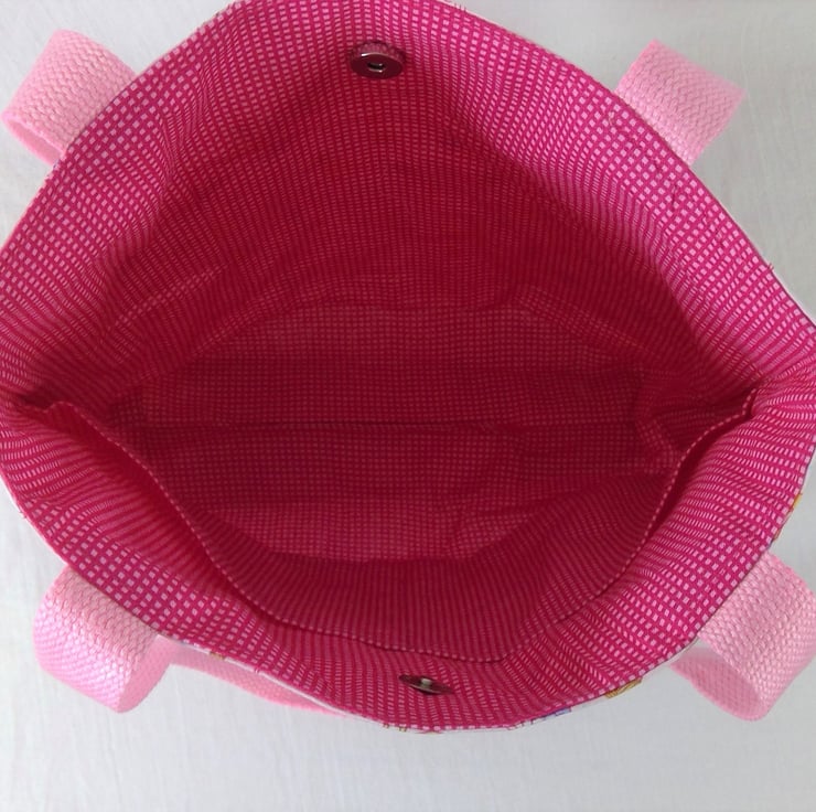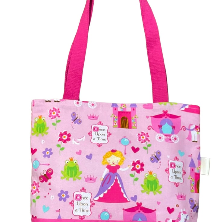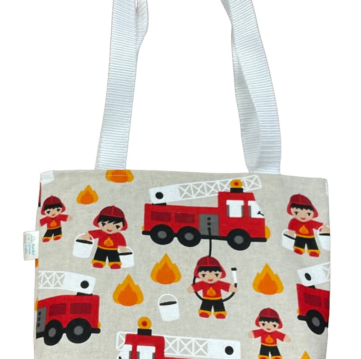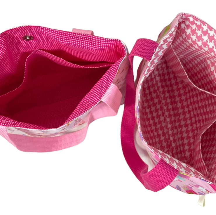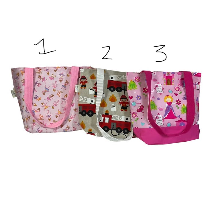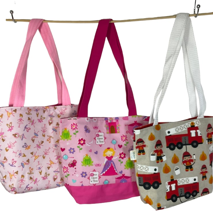 First we have a Cute but classic ballerina fabric that would be a wonderful ballet or everyday bag for small girls, but tasteful enough for older girls or even adults! The fabric has little ballerinas In various dance poses on a pale pink background. I have fully lined the bag in cerise and paler pink mini check cotton, next is a unapologetically girly princess fairytale print with frog princes and castles and a carriage, this is lined in old rose pink and white dogtooth check. Finally a cute fireman bag made in heavier weight canvas and lined in red with white spot cotton.