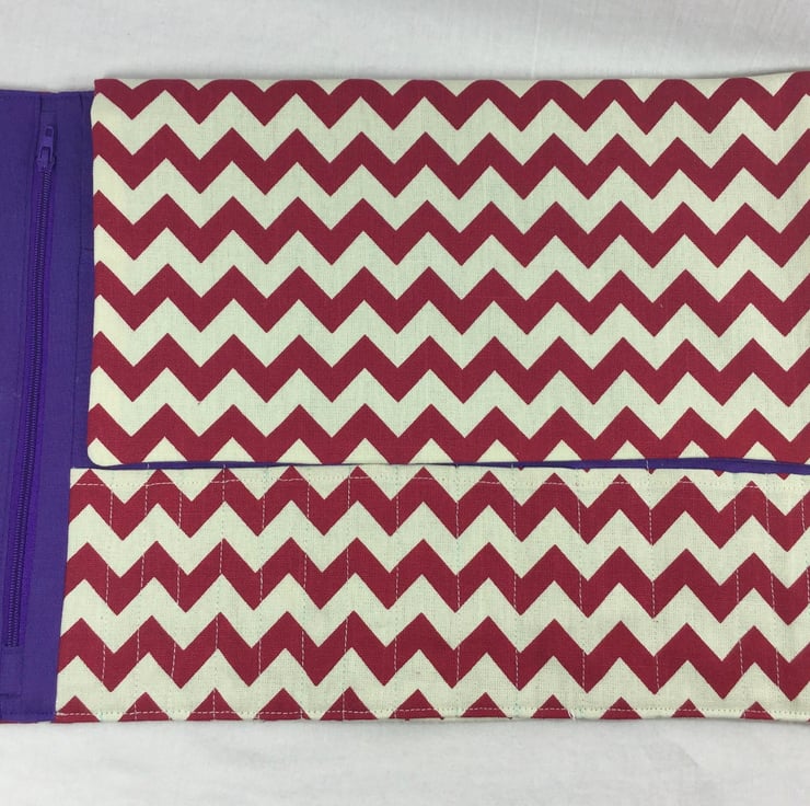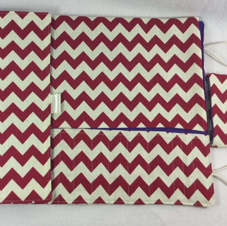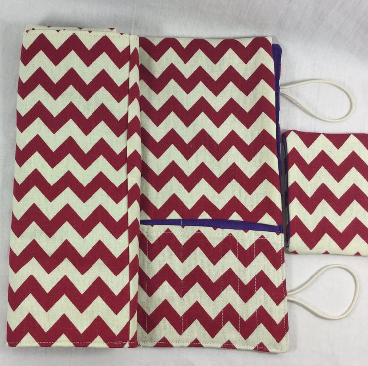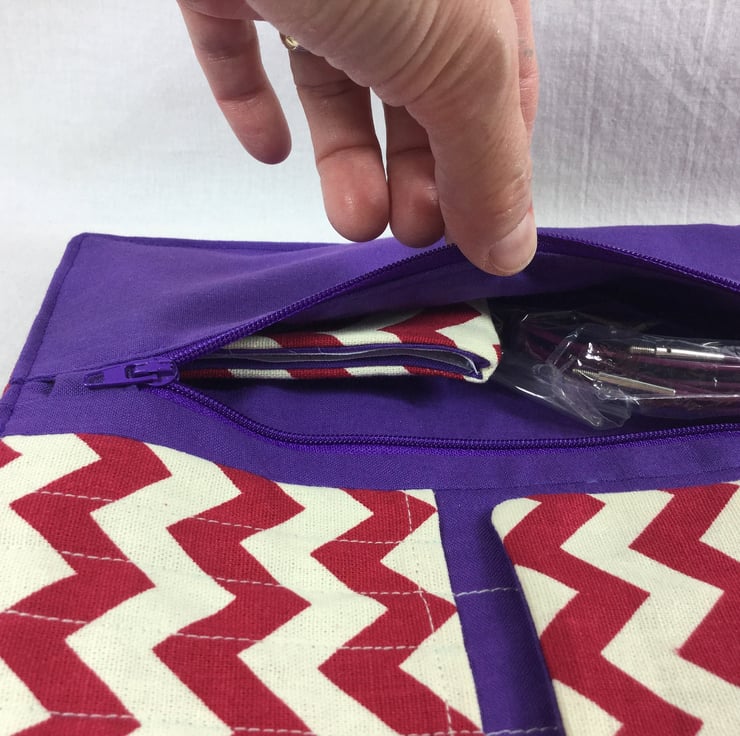 This handy case is made to last from a heavy weight outer fabric, the main being a smart chevron print in deep red on a cream background. The lining and accent is a deep violet. The lower pockets will hold 13 sets - a complete set of interchangeables - from 4"in length right up to 10mm, there are also 3 slots in this pocket that will hold crochet hooks. In the pocket above there are 7 slots in graduated sizes, that can hold DPN 8" or longer. depending on the size of your needles, these slots can house more than one set.