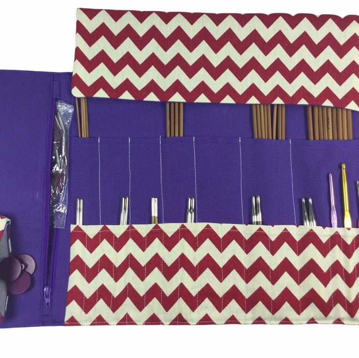 Red interchangeable and double pointed knitting needle case, chevron print knitt