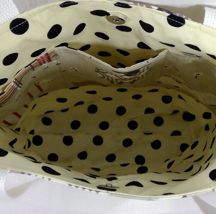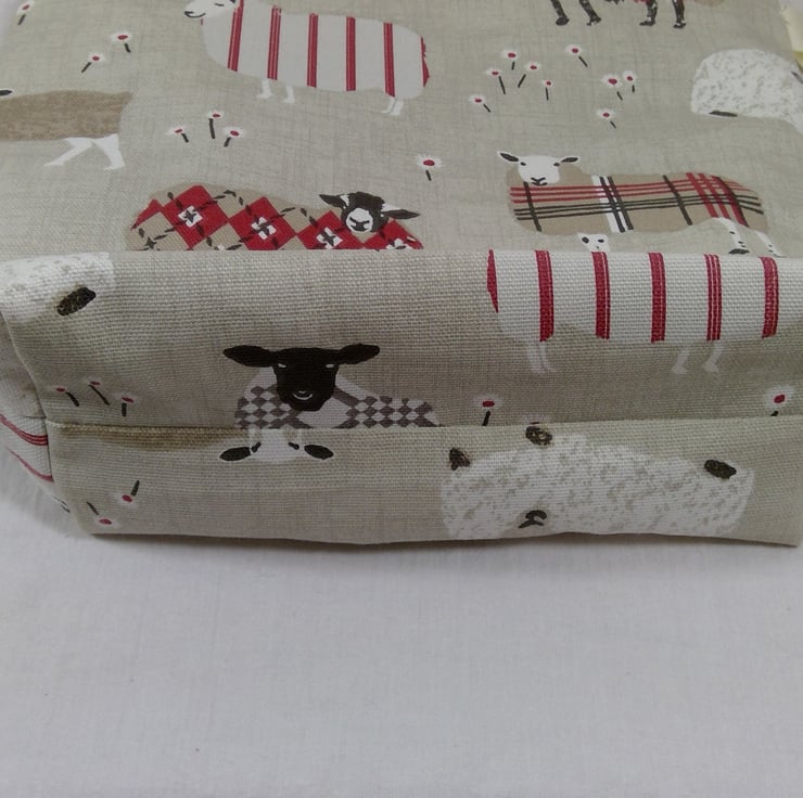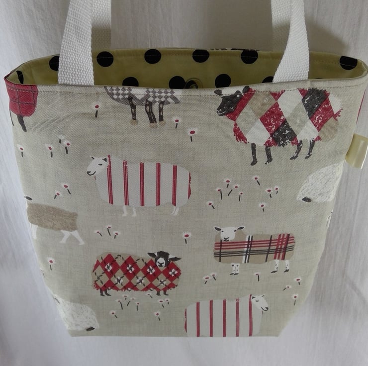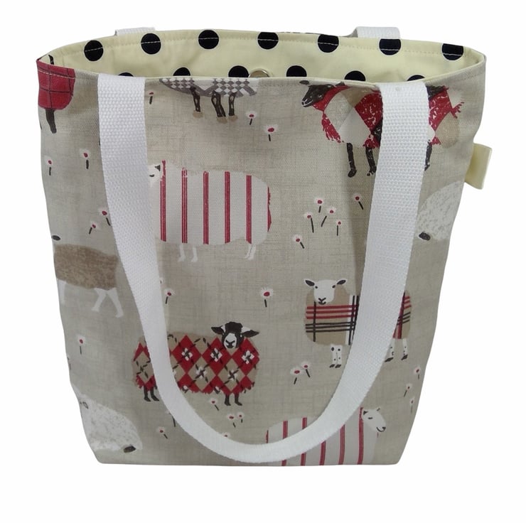 The fabric outer layer is a heavyweight cotton fabric with tartanargyle sheep in red, chocolate, grey and white. The lining is cream with black spot cotton. Inside is a full width set of pockets, split into 3 slip pockets. The bag fastens with a magnetic snap.