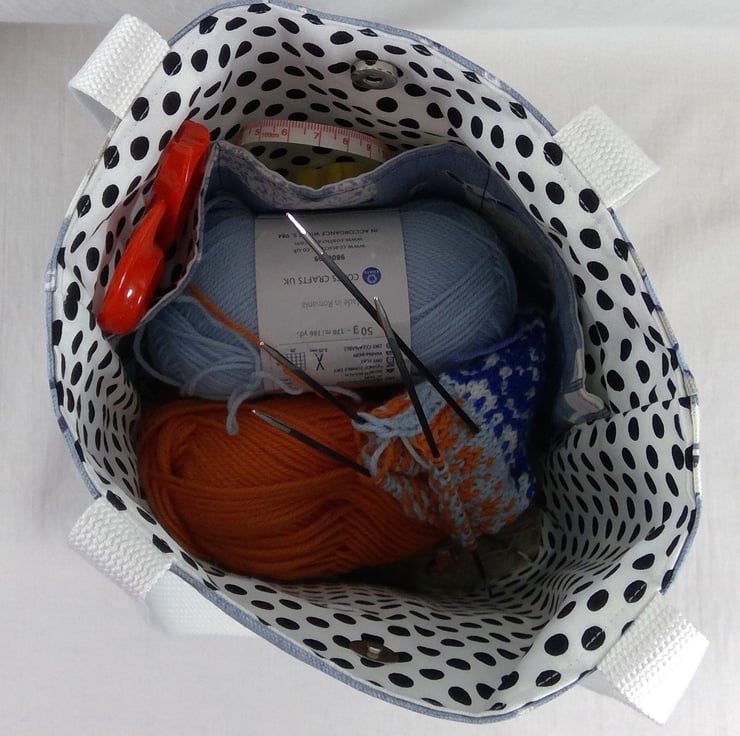A small cotton tote bag, in lovely heavyweight cotton fabrics. This would be a perfect small knitting bag, I have it filled with 3.5 50g balls of yarn and needles, plus my WIP (shown in alternative bag -this bag and contents not included in sale) and theres plenty more space! Obviously this would be a perfect everyday bag too, particularly for a sheep lover.