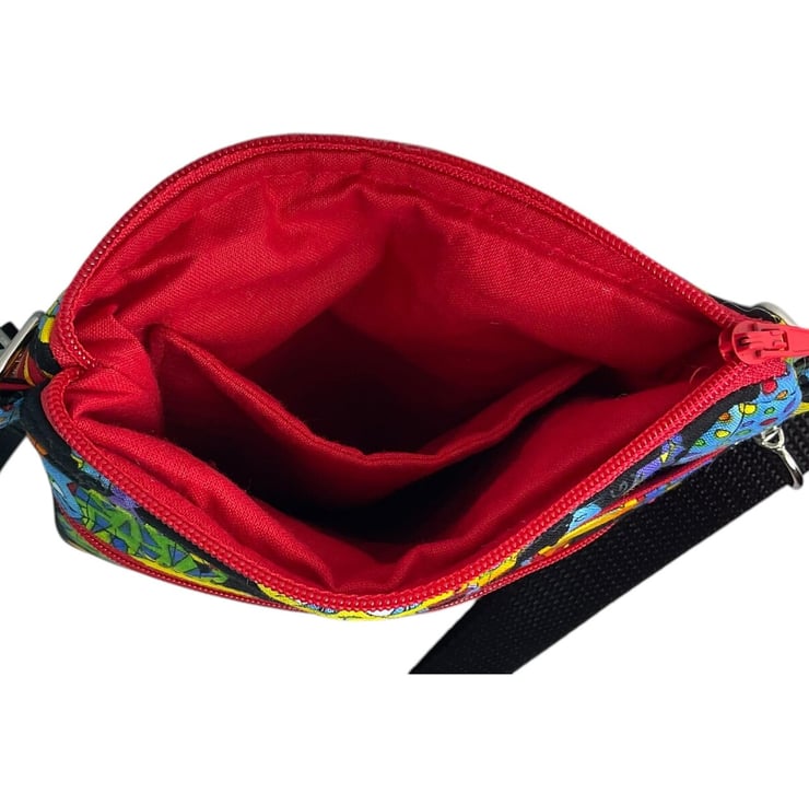 This handy bag is slim so sits close to your body, but is surprisingly roomy thanks to its multiple pockets. I’ve shown an alternative print but identical set up bag with my phone in case, small note pad, mask and my door key.