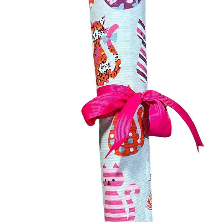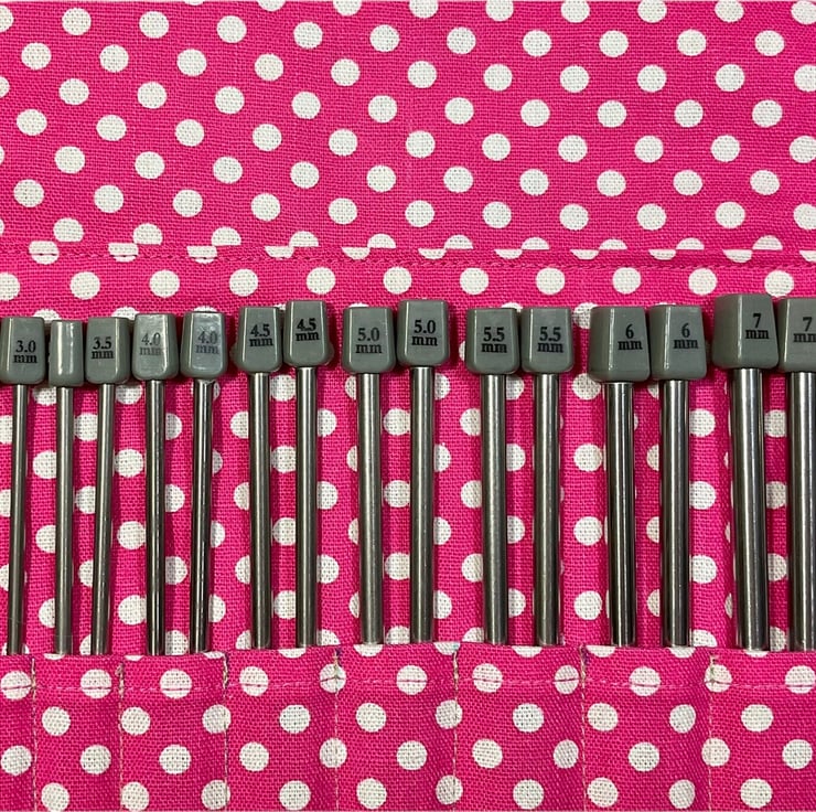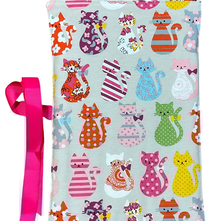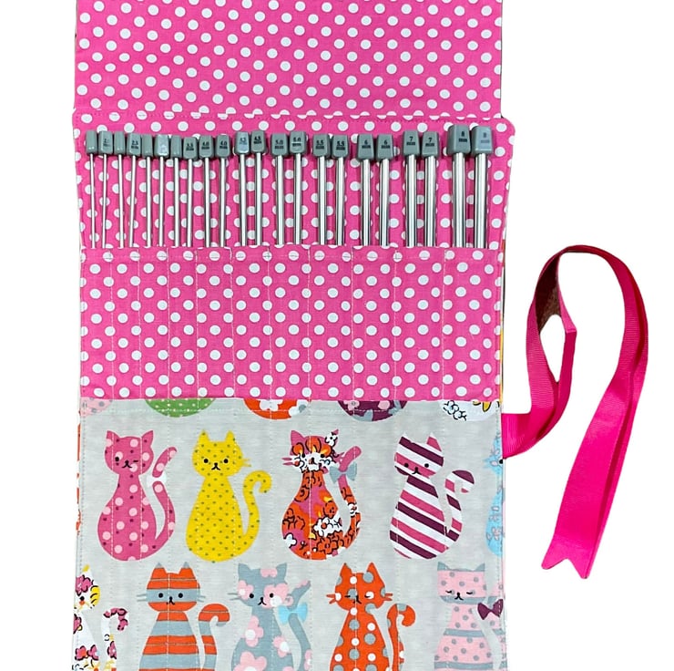 The case is in the cutest colourful patterned heavyweight cats cotton fabric, with a toning mid pink with white spot cotton canvas fabric. The case itself is interfaced for sturdiness and has 2 pockets, the upper pocket houses the 11 sets of stainless steel needles and in the lower cats pocket is space for 11 more. The case rolls up and is fastened by bright pink grosgrain ribbon. pattern placement may vary.