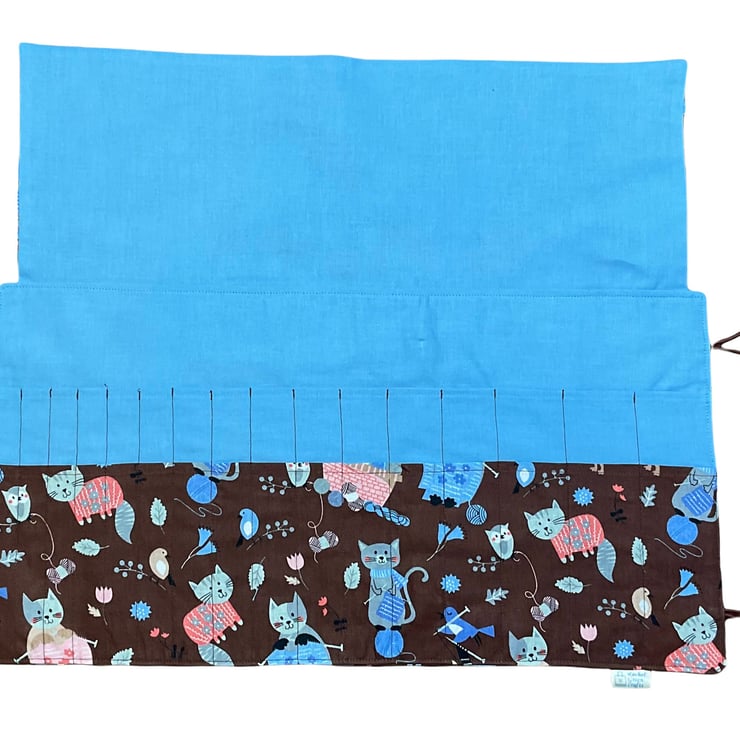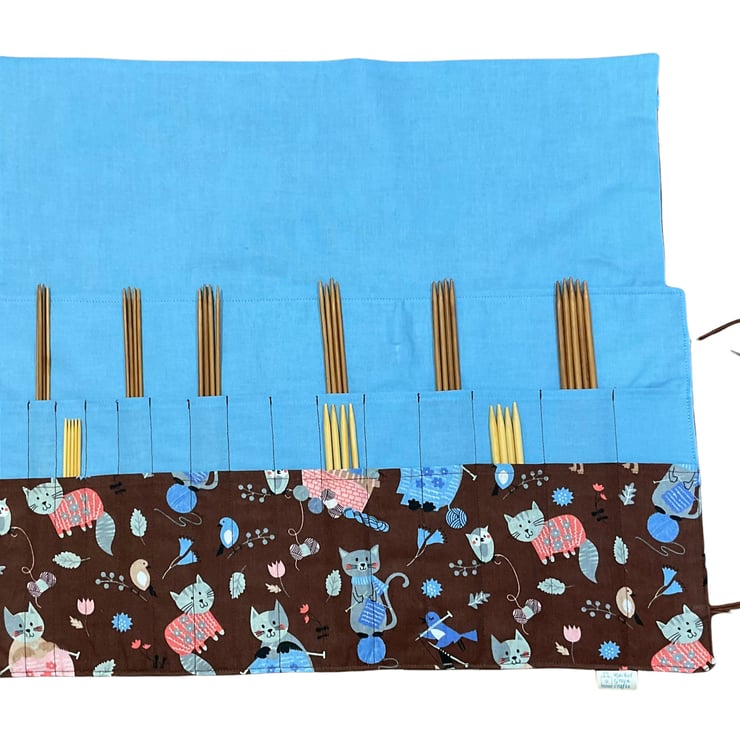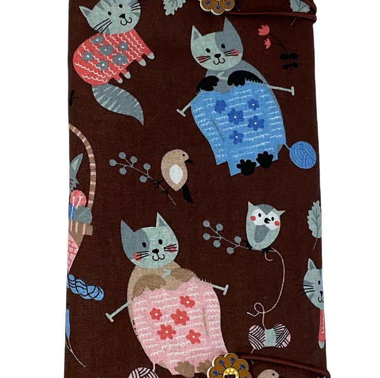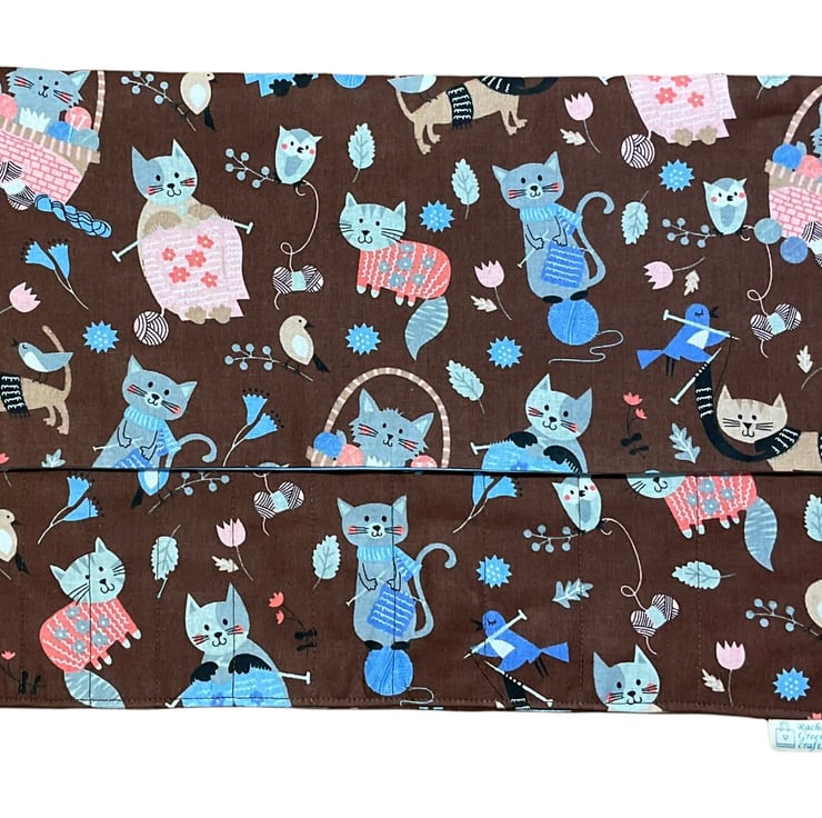 This case is made from A cute cotton knitting cats print fabric on a chocolate base. The case can can also be used for straight needles up to 25.5cm (10") or maybe crochet hooks.