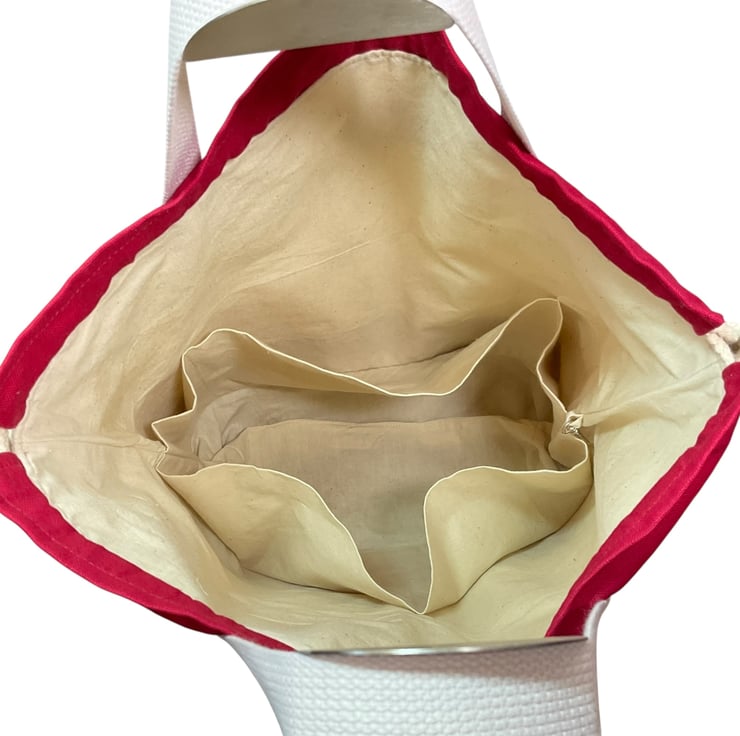 Inside the bag is lined with a natural cotton and around the whole circumference are pockets in varying widths, a total of 5, 2 being perfect for needles up to approximately 30.5cm (12) in length, longer if you allow them to poke out of the top! The others work well for notions, patterns etc. There is also a lobster clasp on webbing perfect for holding stitch markers or maybe keys.