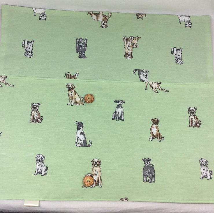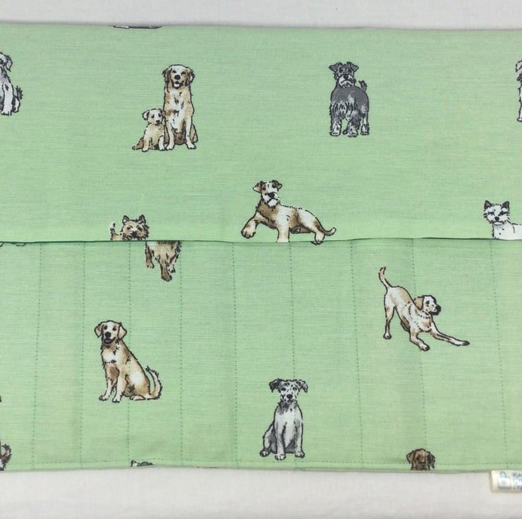 This case is made In cute dog breeds printed cotton heavier weight fabric in natural shades on a pale green background.