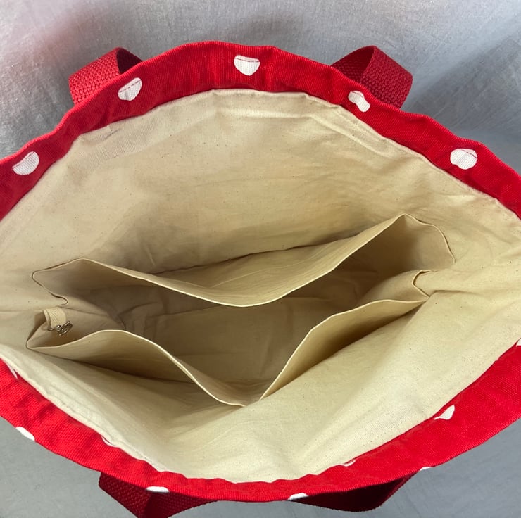 The main fabric is a lovely spoon flower designers Raccoon print on a denim blue base and I have paired it with a red with white spots heavier weight cotton. Inside the bag is lined with a natural cotton and around the whole circumference are pockets in varying widths, a total of 5, 2 being perfect for needles, the others for notions, patterns etc. There is also a lobster clasp on webbing perfect for holding stitch markers or maybe keys.