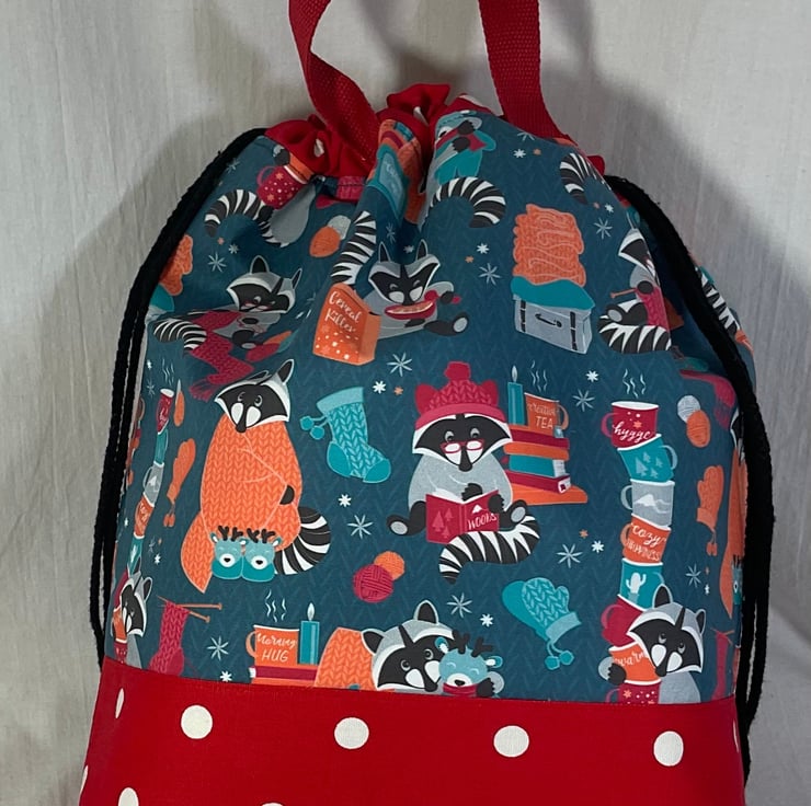 Extra Large knitting and craft bag with raccoons, multi pocket bag