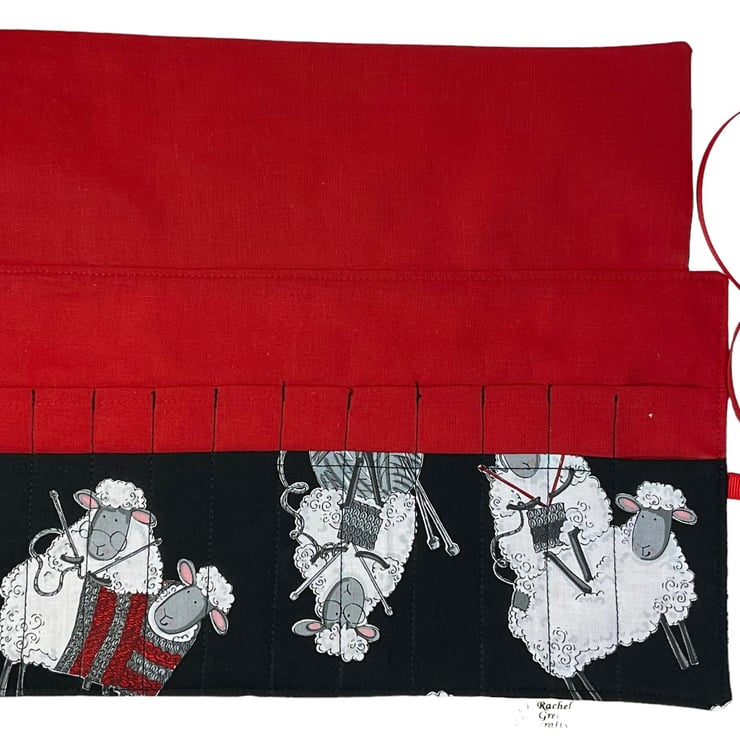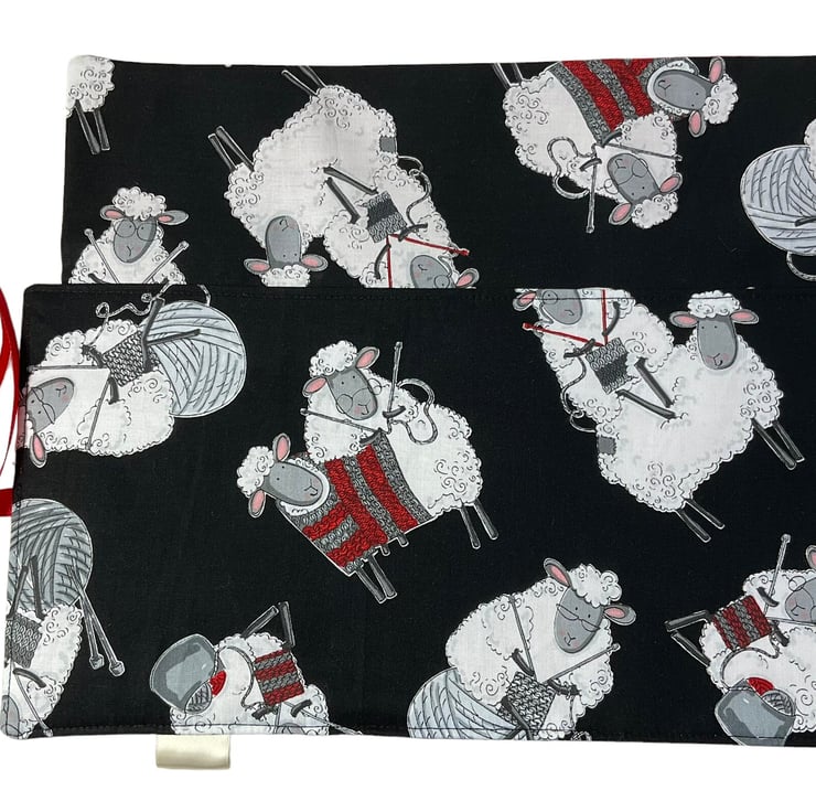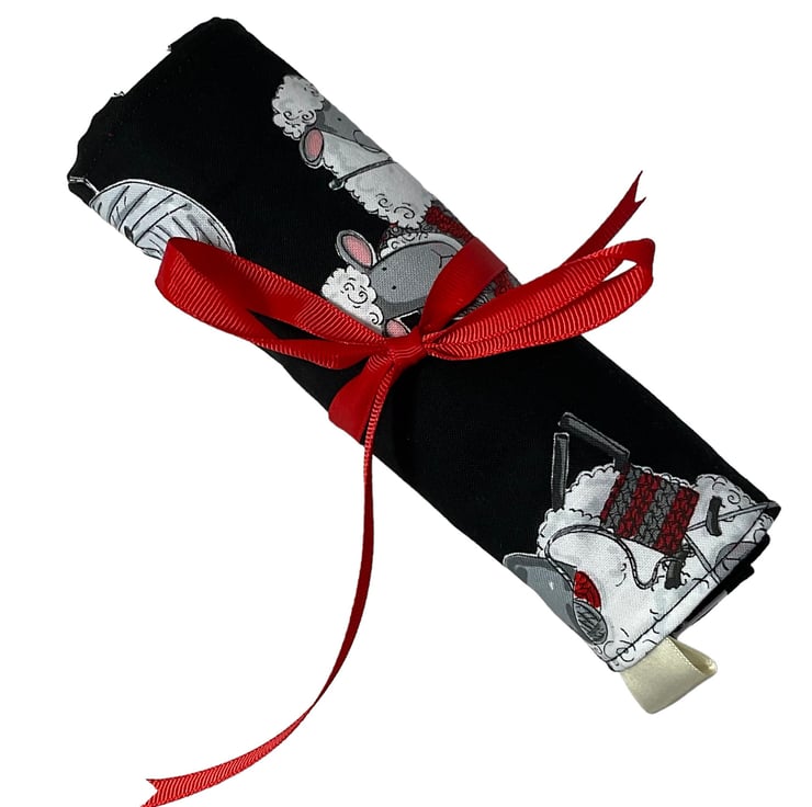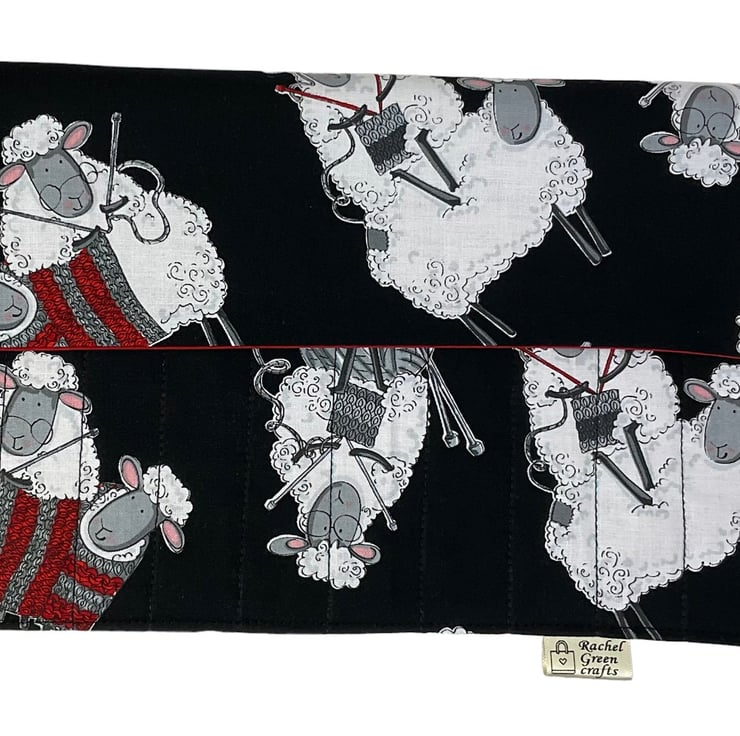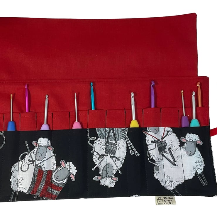 A lovely knitting sheep fabric is the centrepiece of this crochet hook case, set on a black background, I have carefully paired it with a red cotton fabric for the lining, larger pocket and inside of the flap