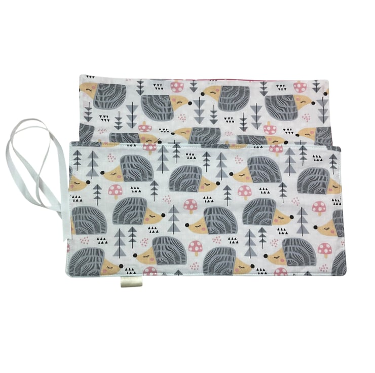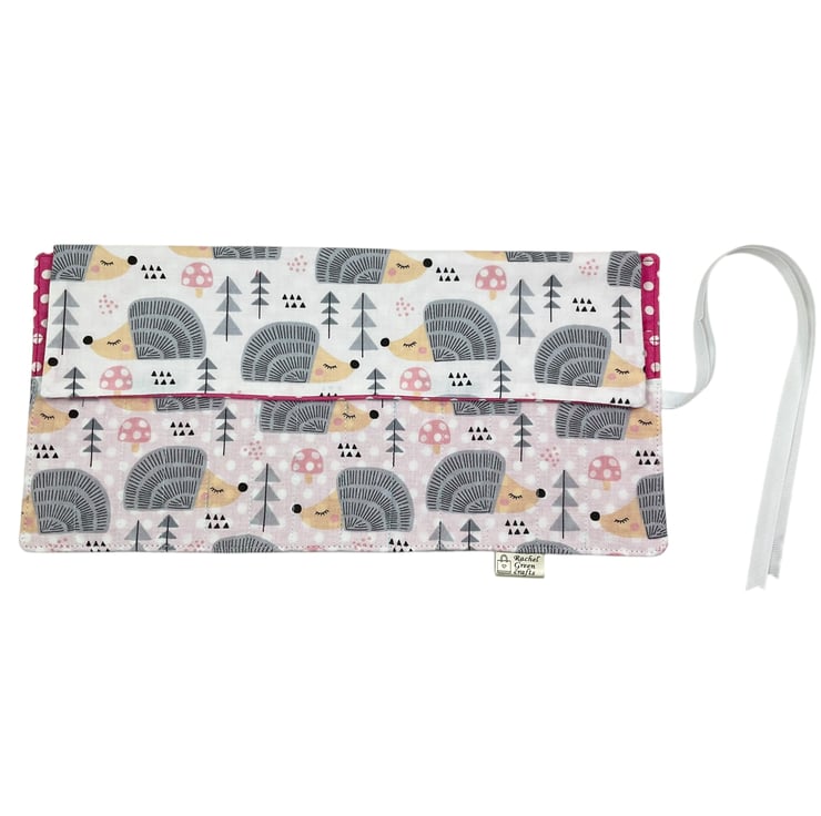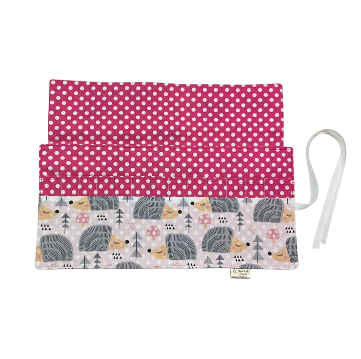 A cute hedgehog patterned fabric is the focal point of this crochet hook case, with a White background. I have carefully paired it with a toning heavier weight cerise pink with white spot cotton for the lining, underside of the flap and upper needle pocket.