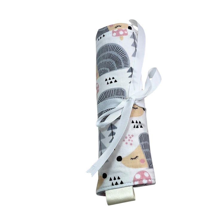 The needles are held in place with a flap Made in the hedgehog fabric. The whole case neatly rolls up and fastens with a pink grosgrain ribbon.