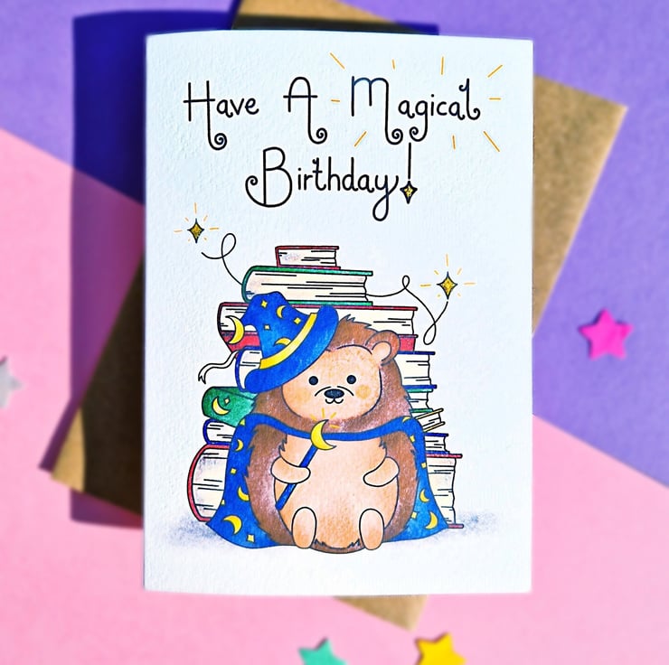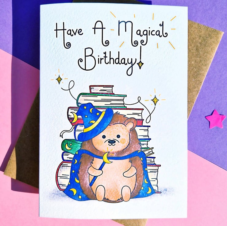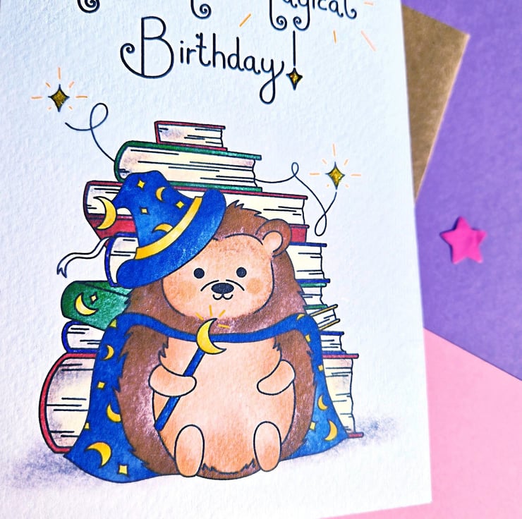 A hedgehog birthday card full of magic! This adorable A6 birthday card is handprinted on textured card and glittered by hand!