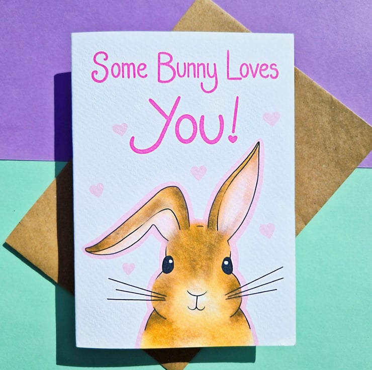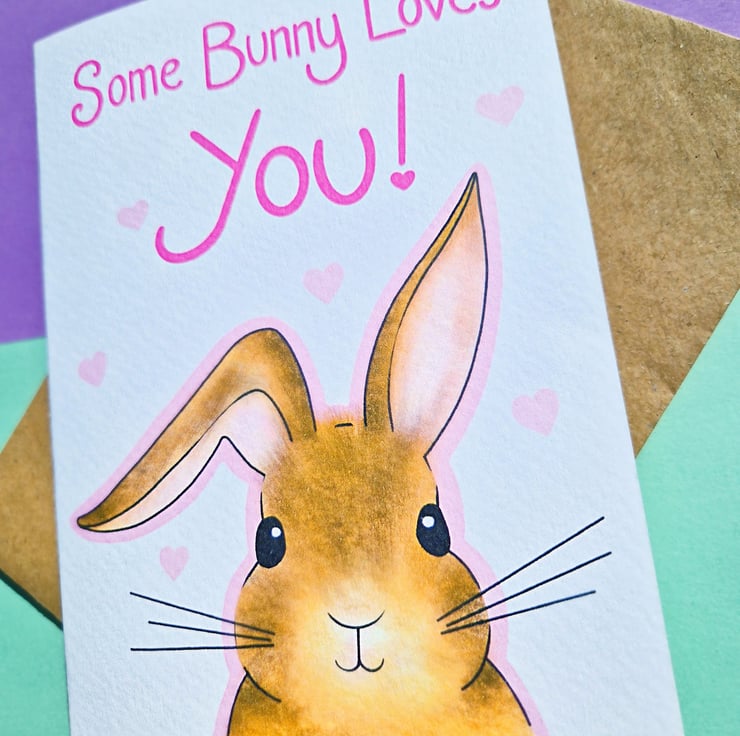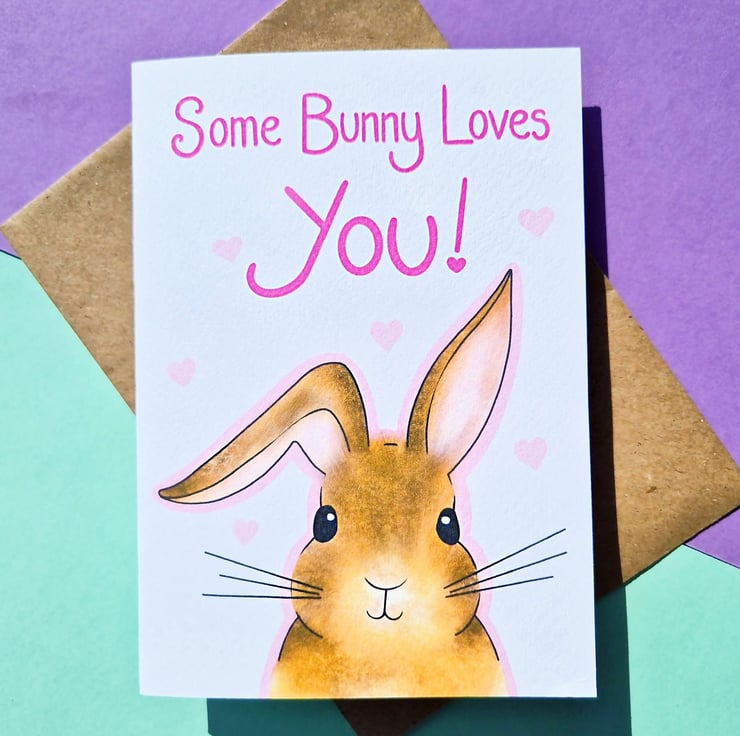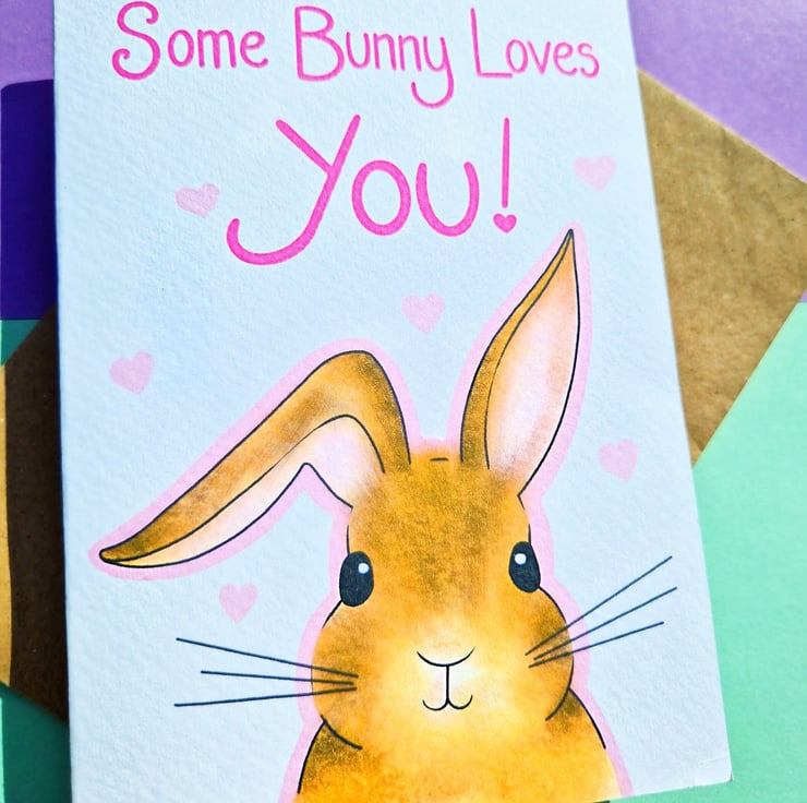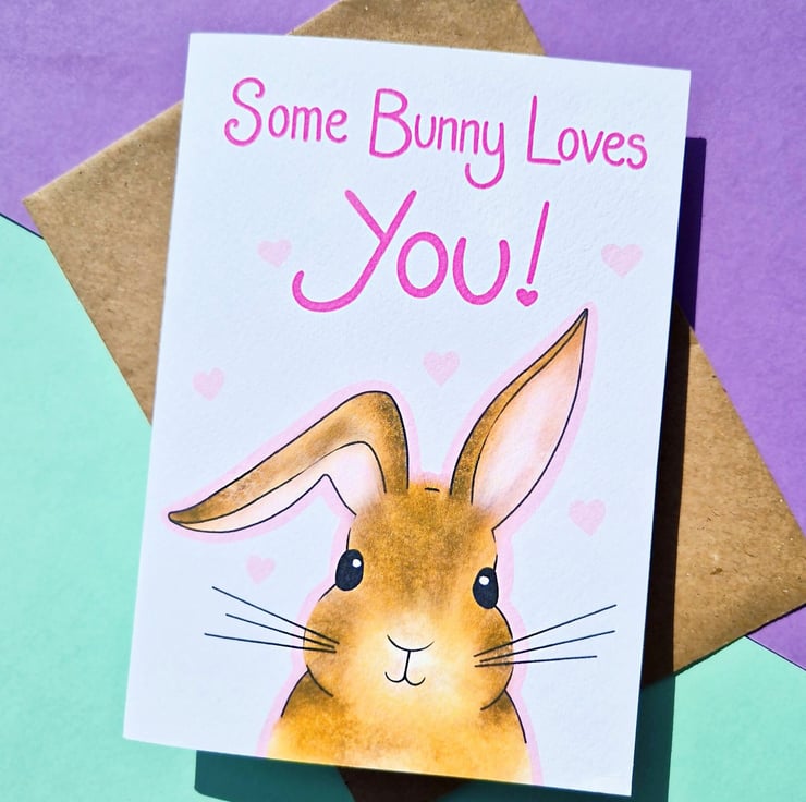 An adorable valentines day card, show your some-bunny how much you love them! This loveable A6 card is handprinted on textured card and is ideal for birthdays, anniversaries and more.