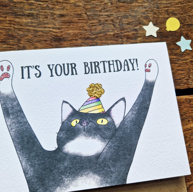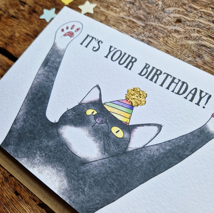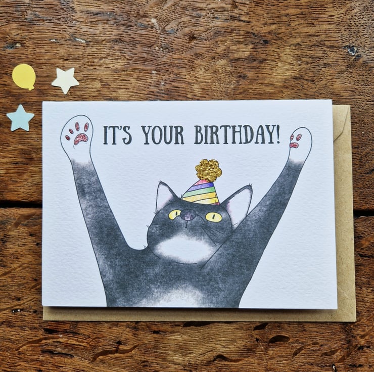 A tuxedo cat birthday card, the purrfect way to celebrate your friends and loved ones birthday! This A6 cat birthday card is handprinted on textured card and glittered by hand.