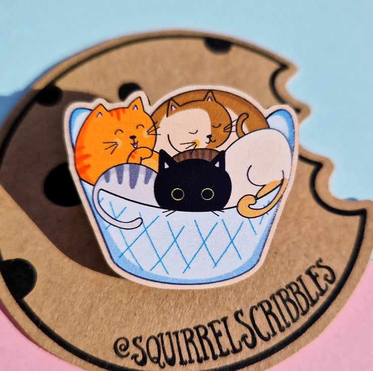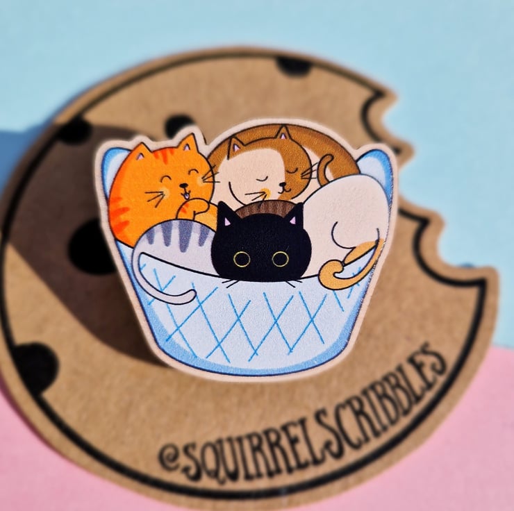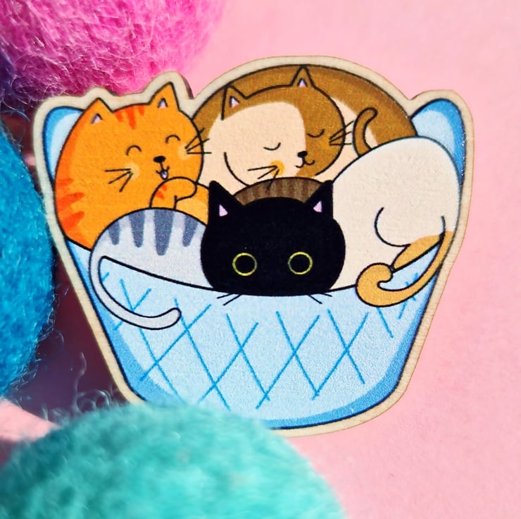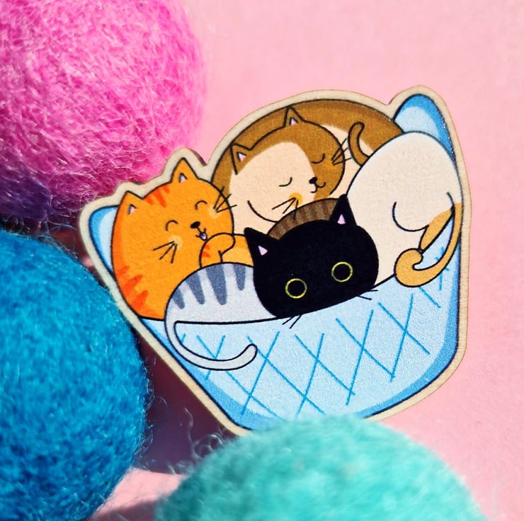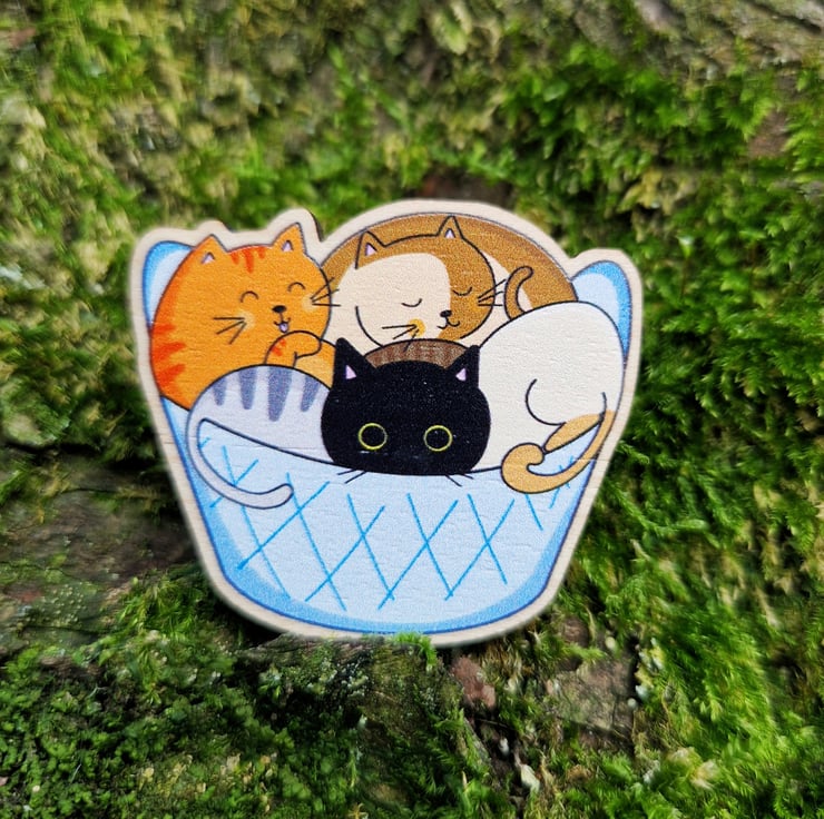 A cat pin for the cat lovers, the perfect gift: a basket of cats! Crafted from FSC wood with a choice of metal or rubber backing, and posted with zero plastic; these cute kitties make the perfect eco-friendly gift for everybody!