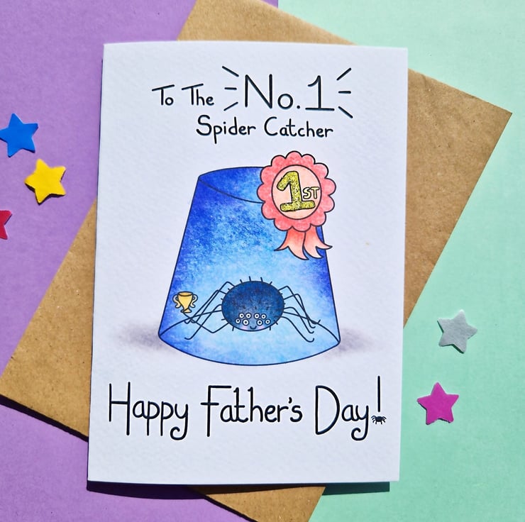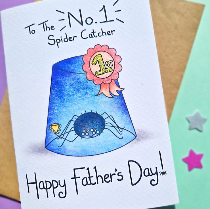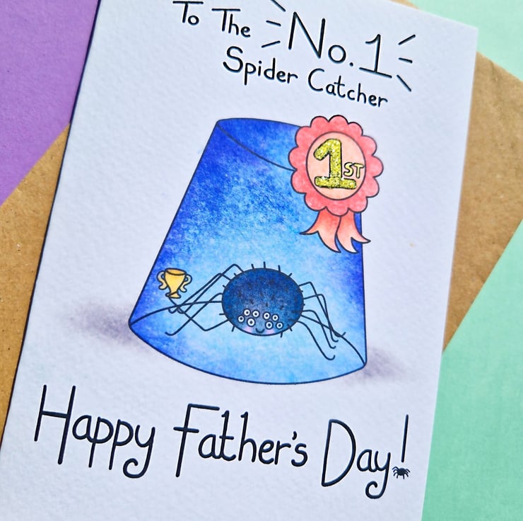 A funny (yet true) fathers day card for your number 1 spider catcher! This perfect dad card is a cute A6 size, handprinted on textured card and glittered by hand.