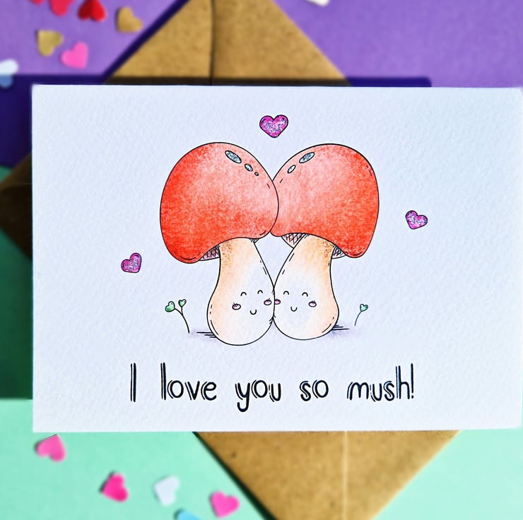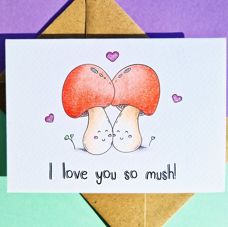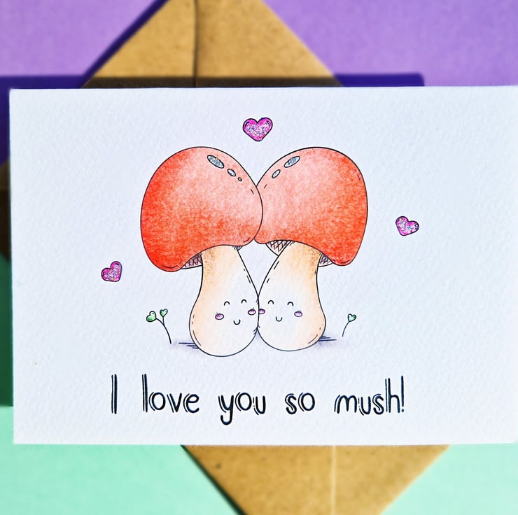 Share your 'mushy' love with this adorable A6 card, handprinted on textured card and glittered by hand. Ideal for anniversaries, birthdays and more!
