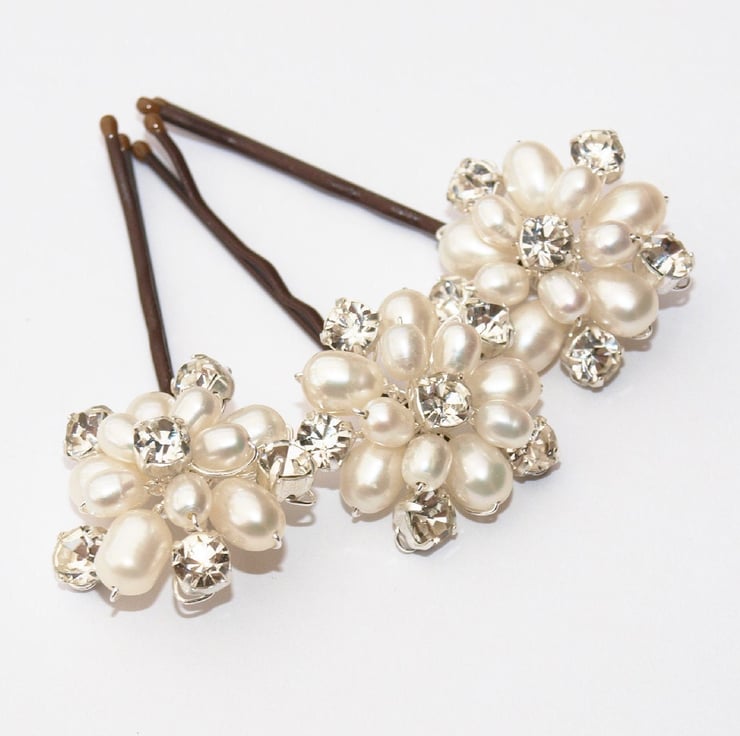 Set of 3 handmade natural ivory freshwater pearl and crystal hair pins.