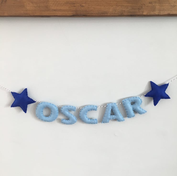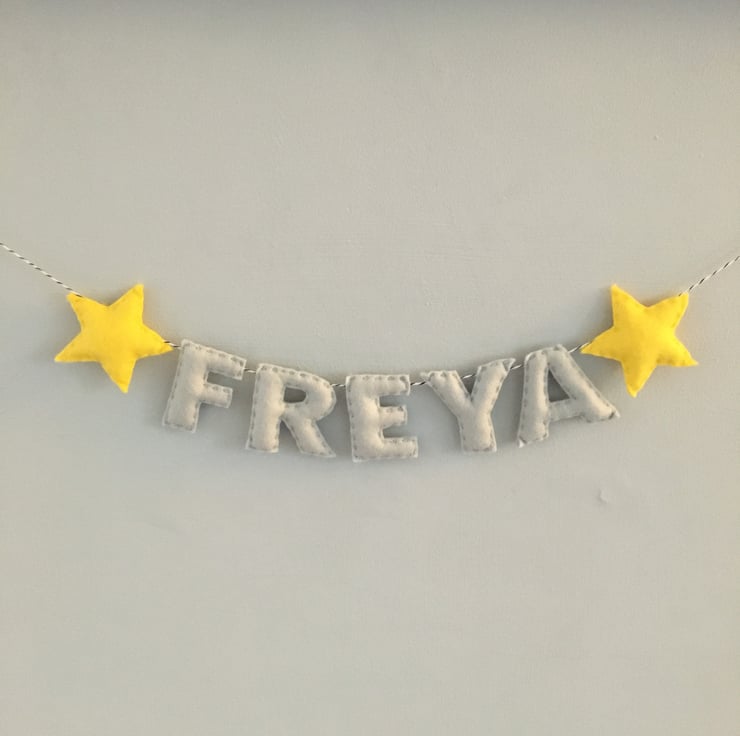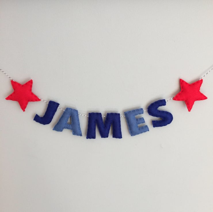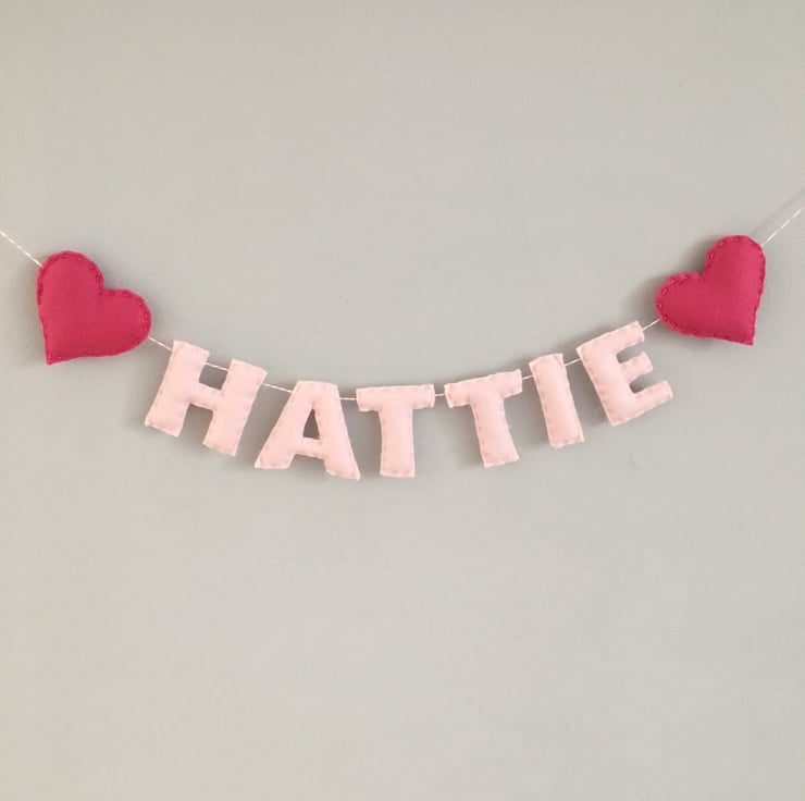 The base price in this listing is for a 3 or 4 letter name, with options to select a longer name. These can be made with any length names, in a variety of felt colours, and on any length twine.