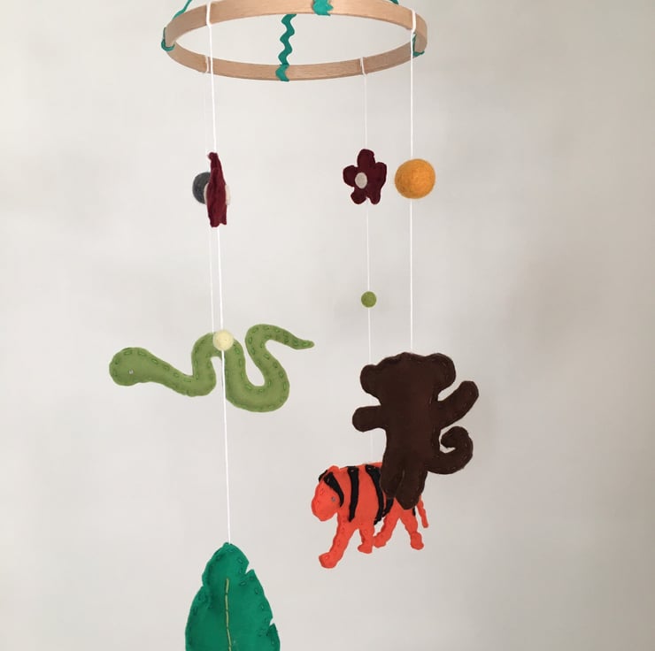 JUNGLE: Featuring a stripy orange and black tiger, a red parrot, green snake (all handmade) a large felt leaf, and some small felt balls, the wooden mobile ring measures 6" (or 15cm) in diameter. Each animal measures about 8cm - 14cm and the height from the top to the bottom is about 50cm. This mobile can be hung with a turquoise ric rac ribbon loop at the top.