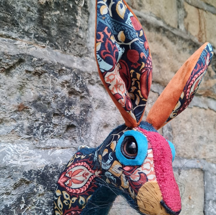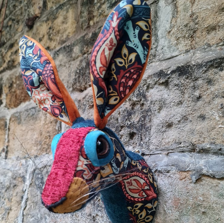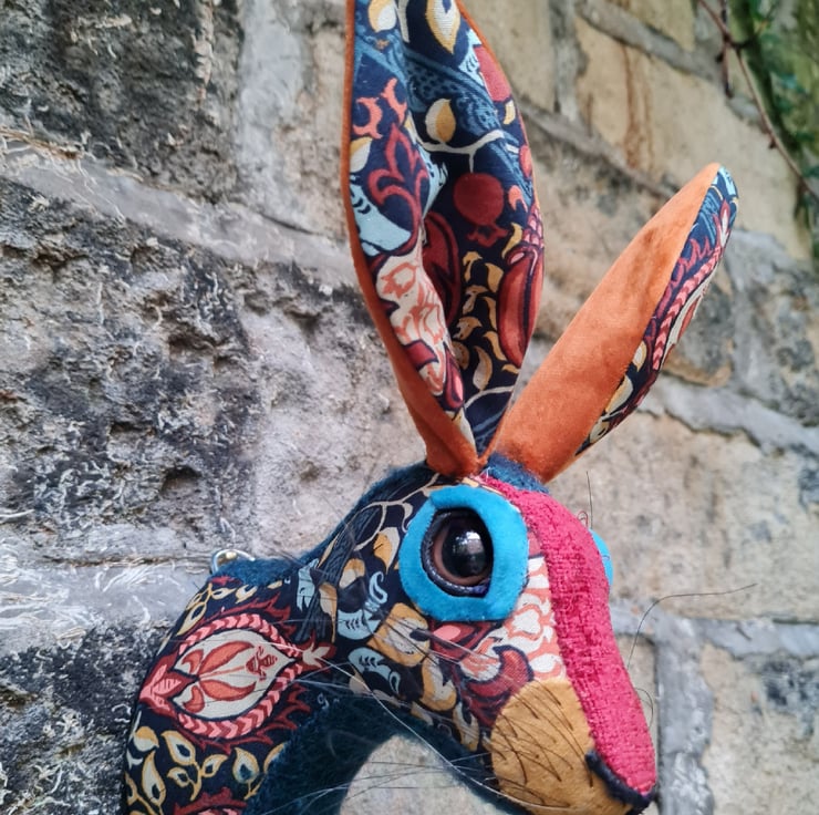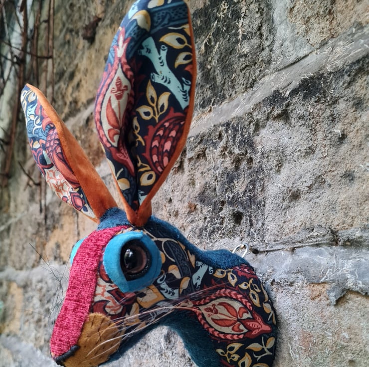 A lifesize faux hare which I have handmade and covered in hand stitched turquoise , teal and orange William Morris Granada fabric. The head is backed with felt and has a metal hanger to hang it on the wall. It is lightweight.