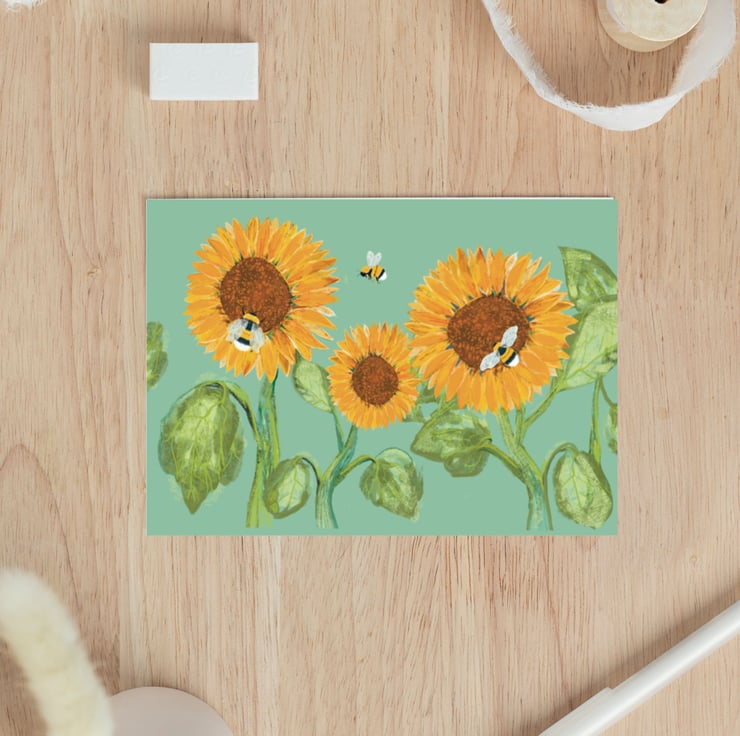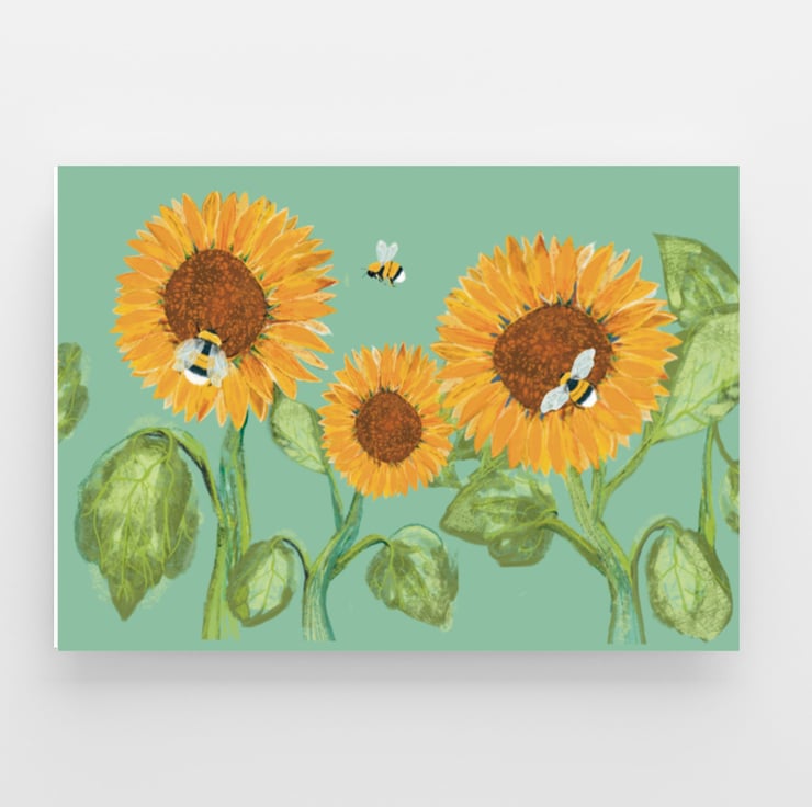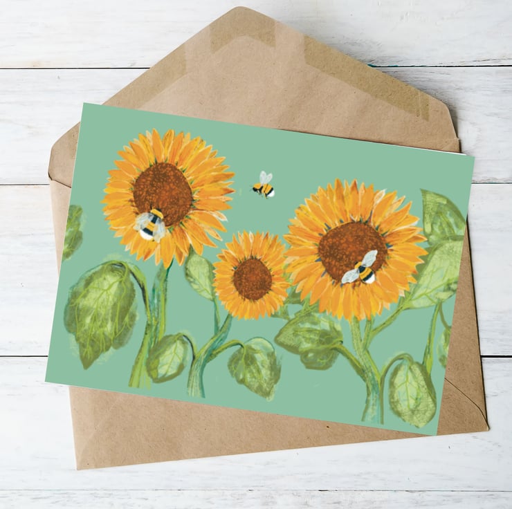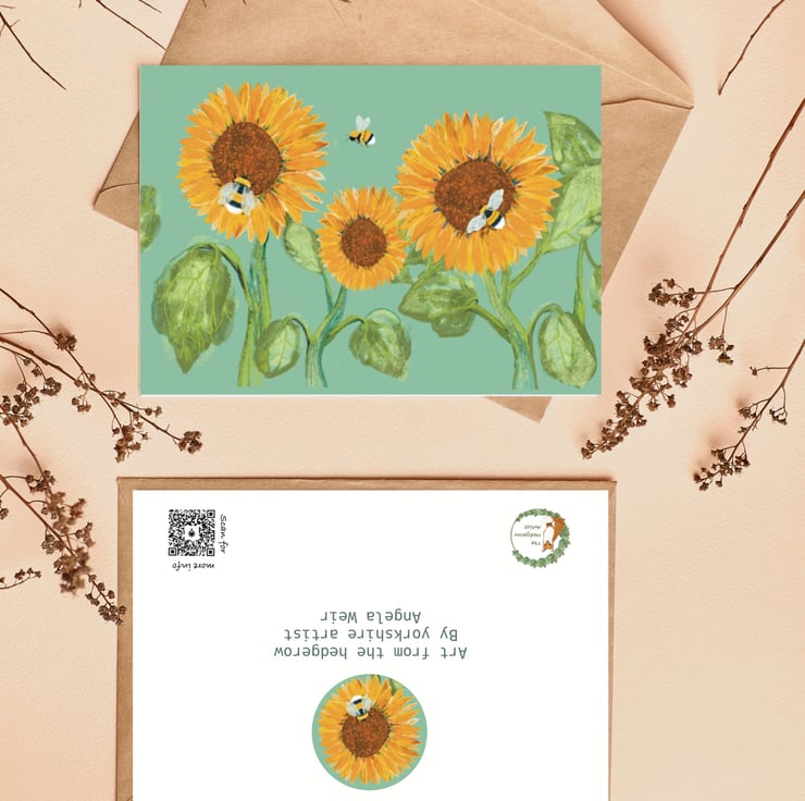 Individual and unique Art Card from The Hedgerow Artist with beautiful bees and sunflowers. It would be a great card for so many occasions from a little hello to a BIG thank you.