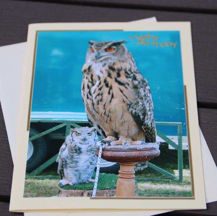 Photograph taken at a country show of a couple of Eagle Owls (European Eagle Owl, and an Ural Owl at back). Photograph from my archive. Card suitable for men & women, and children. Perfect for bird lovers, and falconers.