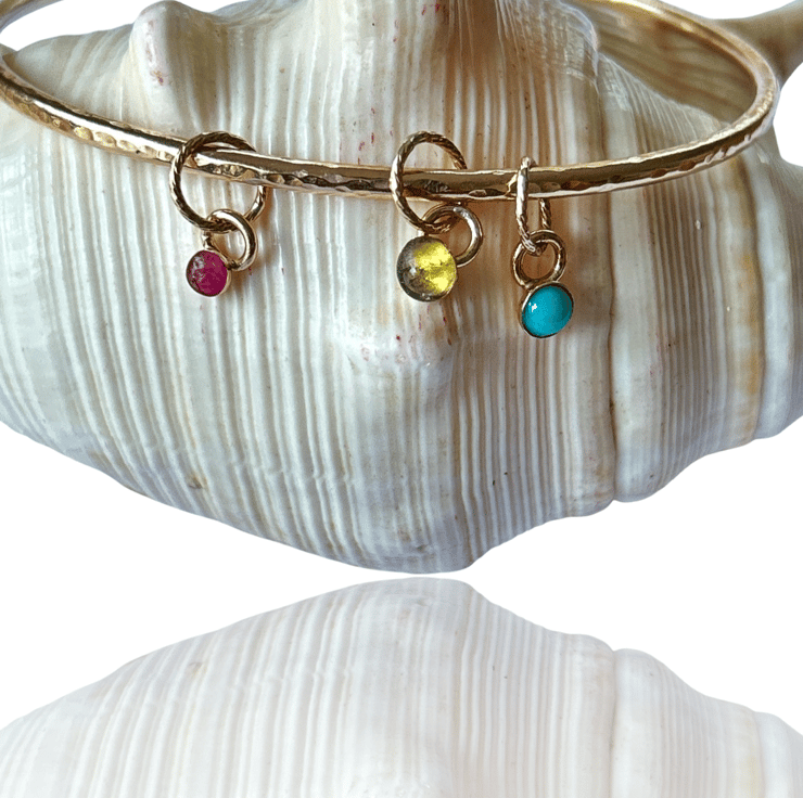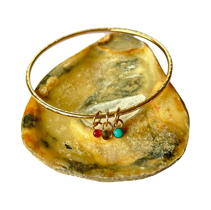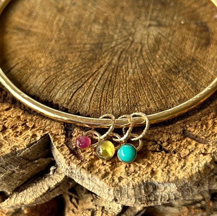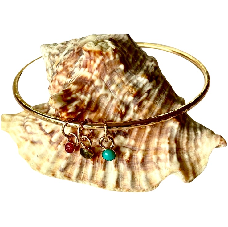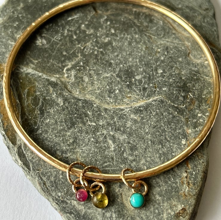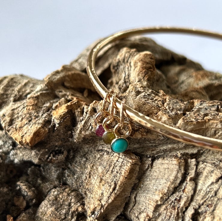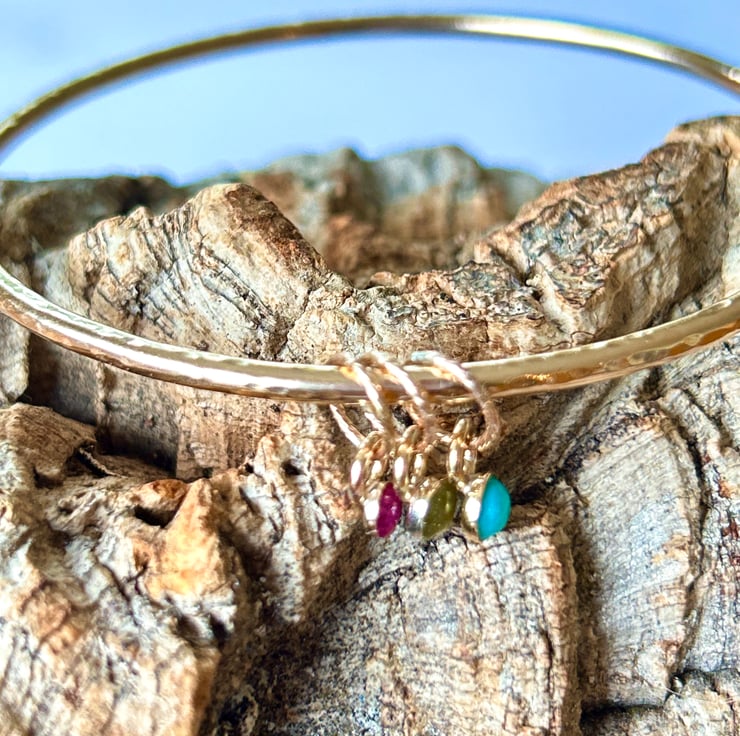 The perfect personalised gift or treat for yourself. Exquisite artisan Handmade 14ct gold-filled bangle. The bangle is 2.5mm round. A solid bangle, with a hammered finish. Featuring three brilliant gemstones - emerald, ruby and peridot - symbolising the birthstones of your beloved family members, this bangle is a tribute to your loved ones or special friends.