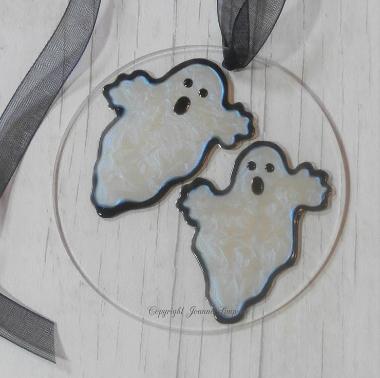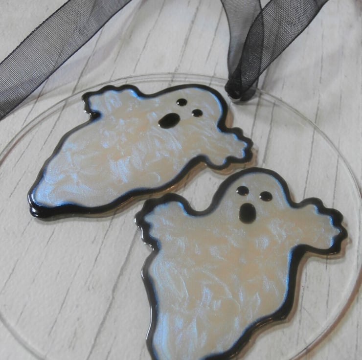 Iridescent ghosts on a clear background. Finished with a black organza ribbon.
